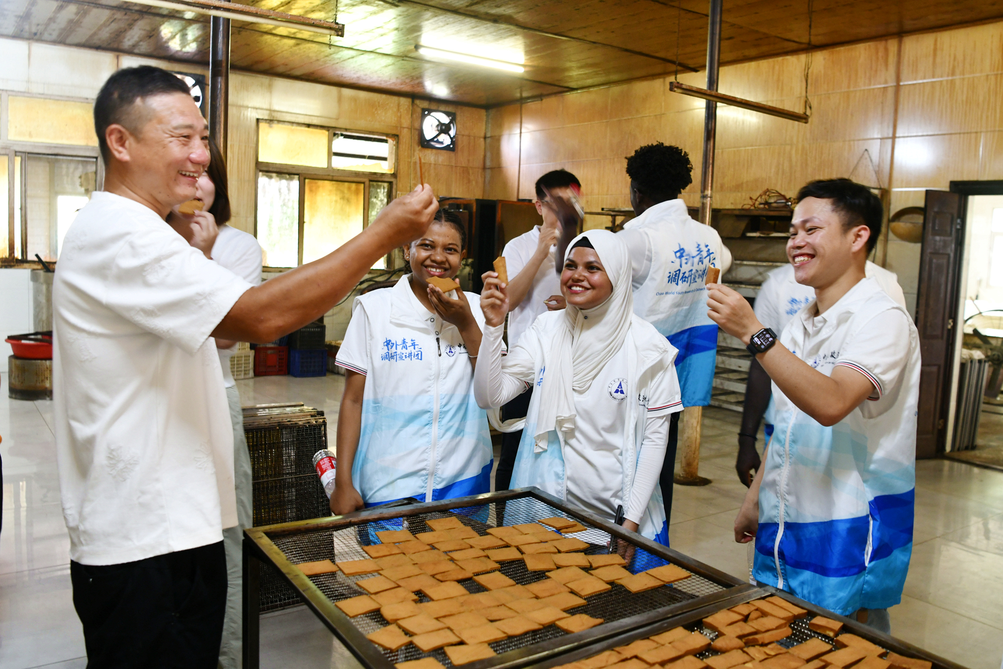 在湖北省咸宁市通城县麦市镇红石村,中南财经政法大学一批留学生品尝麦市豆腐干子。