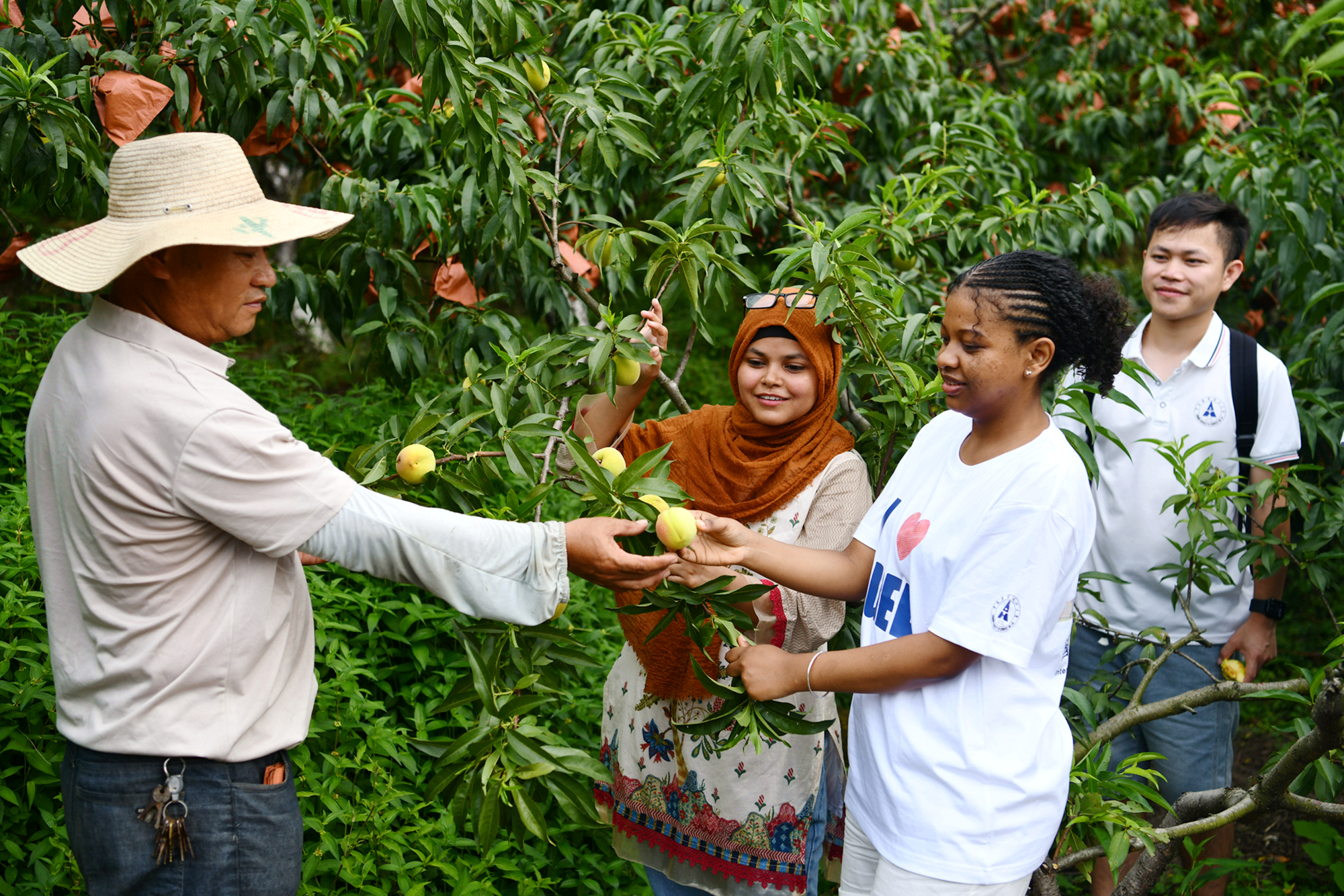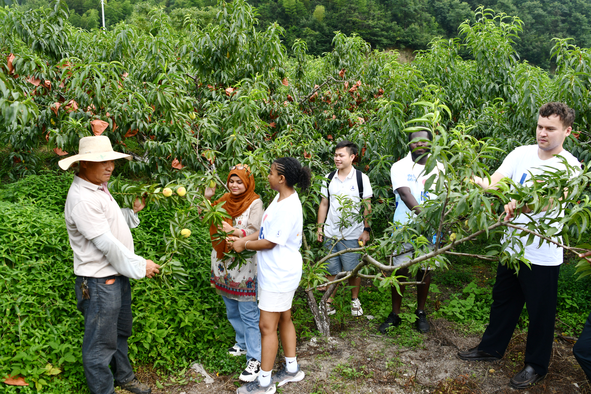 在湖北省咸宁市通城县麦市黄龙山大坳村黄桃基地,中南财经政法大学一批留学生采摘黄桃。