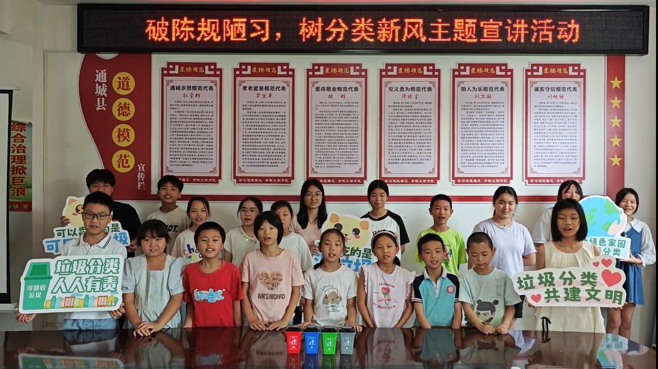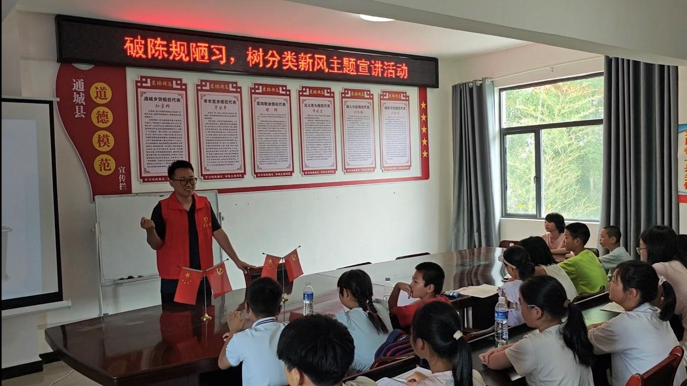 【通讯员 周子焱】7月18日,通城县沙堆镇新时代文明实践所组织镇“青年隽才”宣讲员走进湾船咀村暑假学堂,开展“破陈规陋习,树分类新风”主题宣讲活动。这场别开生面的环保课堂,以“知识讲解+互动游戏”的形式,让垃圾分类理念伴着欢声笑语深植孩子们心中。
