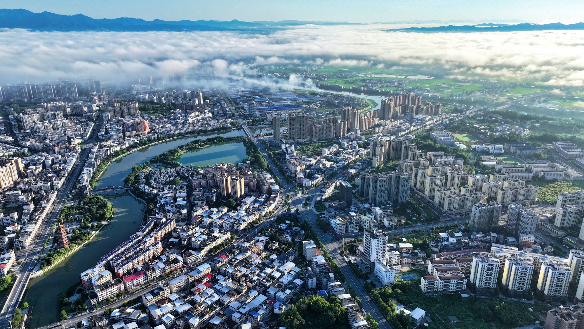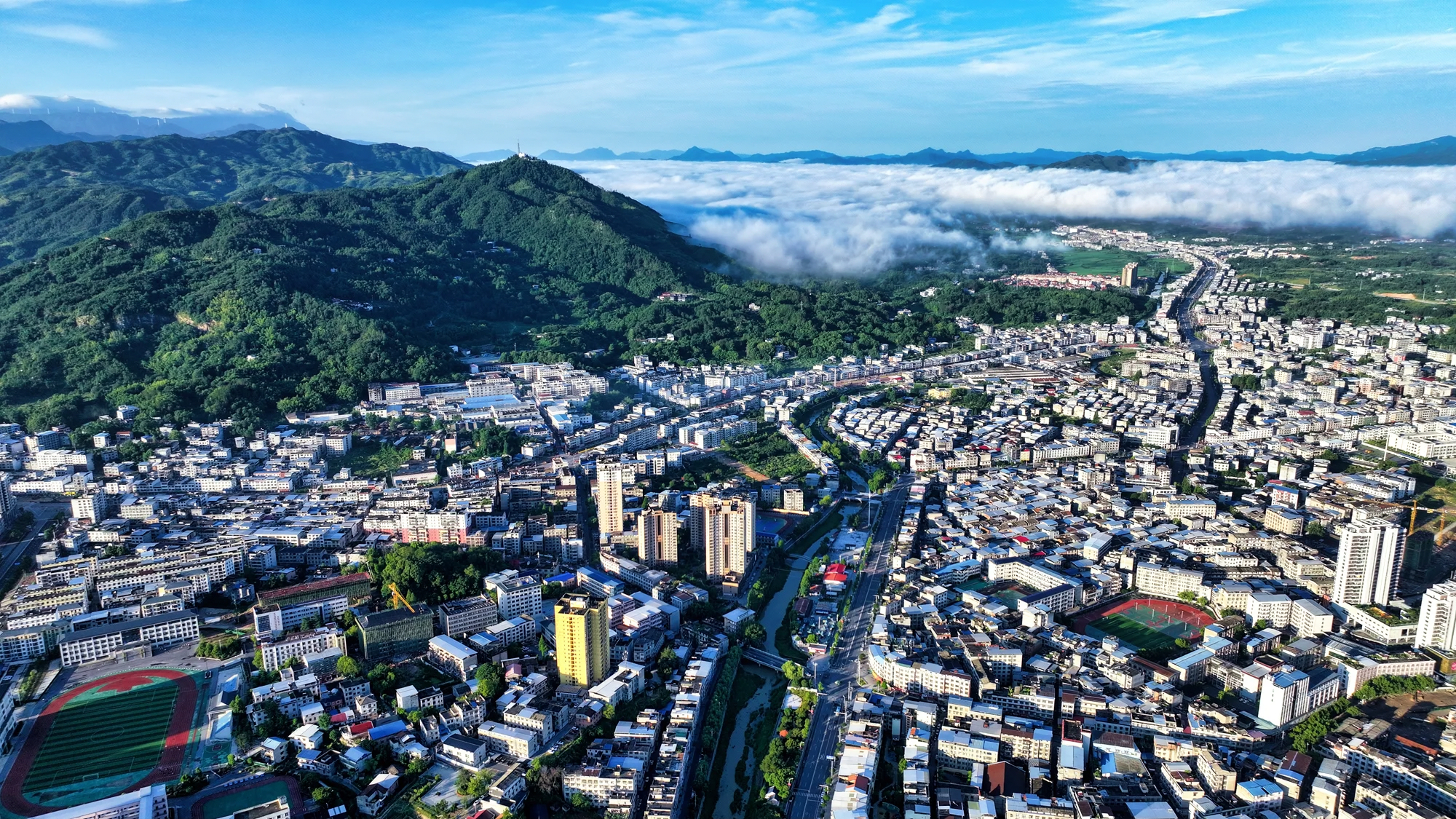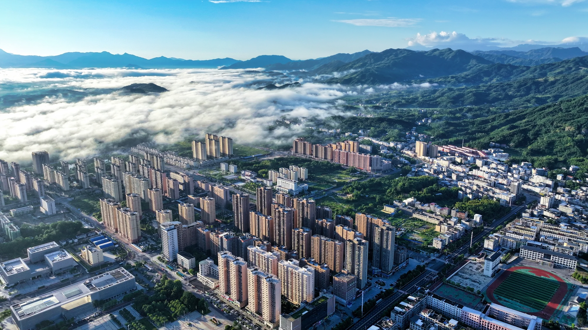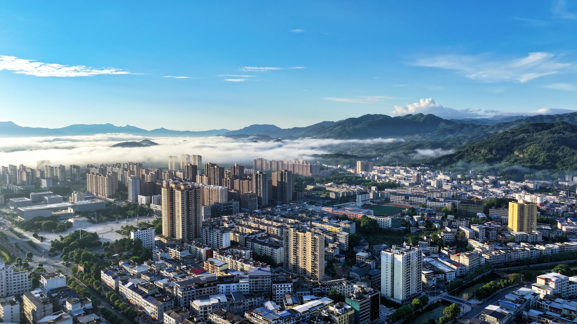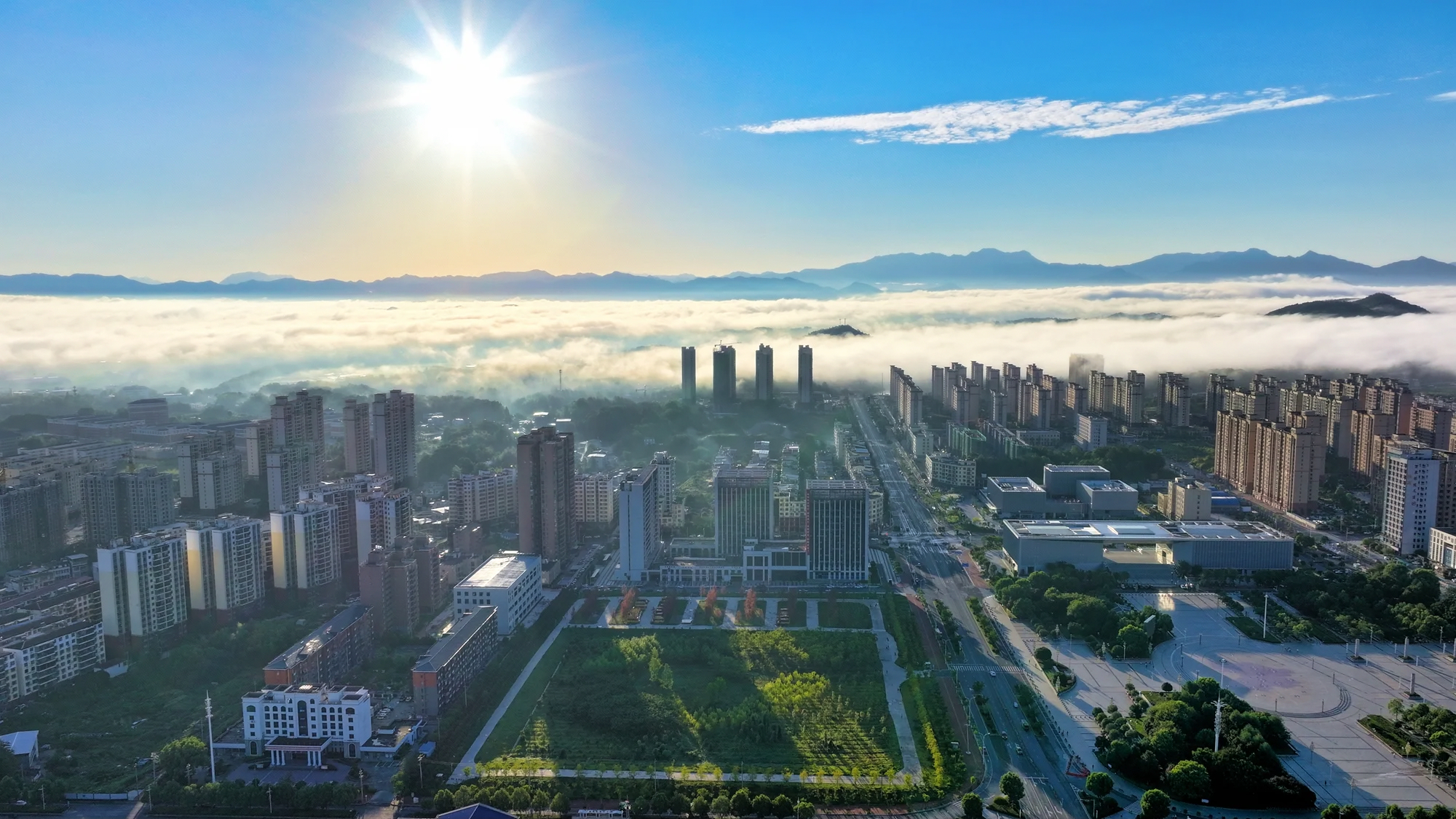 【通讯员 刘建平】7月24日,湖北省咸宁市通城县城区在雨后出现平流雾景观,楼房、山峦、道路和河流在云雾中忽隐忽现,构成一幅山水交融的美丽城市画卷。