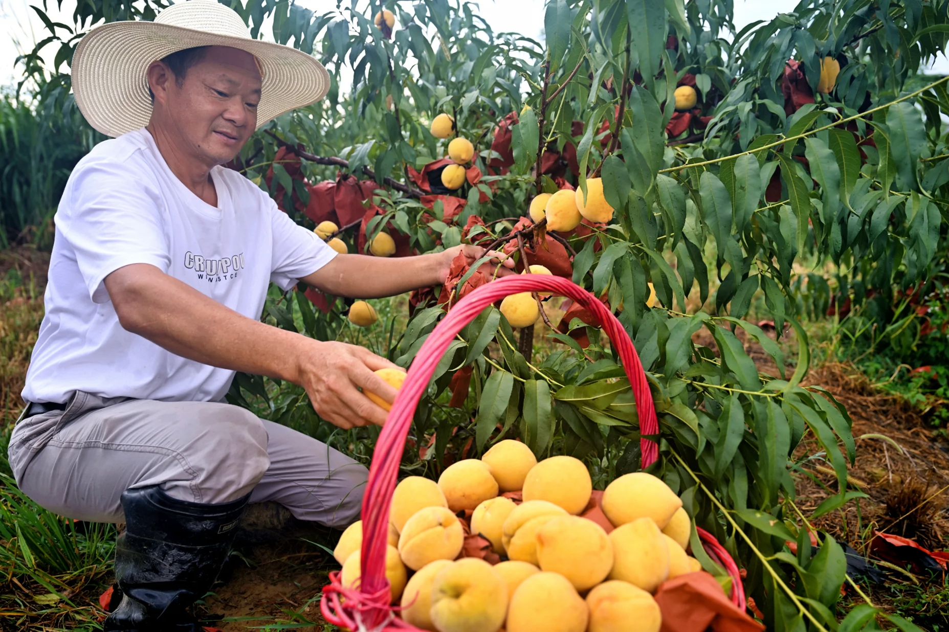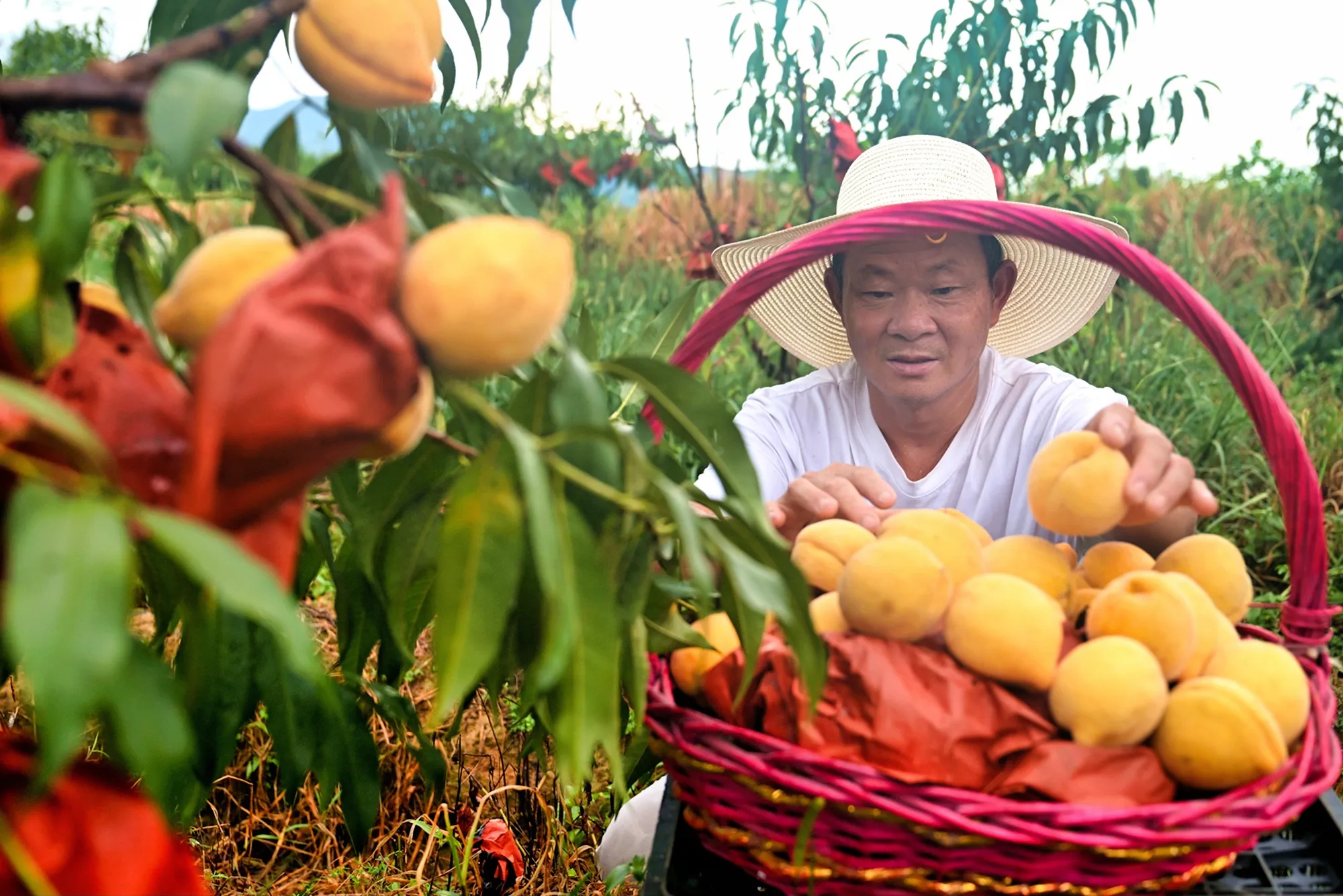 2025年7月27日,湖北通城县关刀镇关刀村玉泉采摘园内,志城绿色农业科技专业合作社的黄桃迎来丰收,果农忙着采摘供应市场。