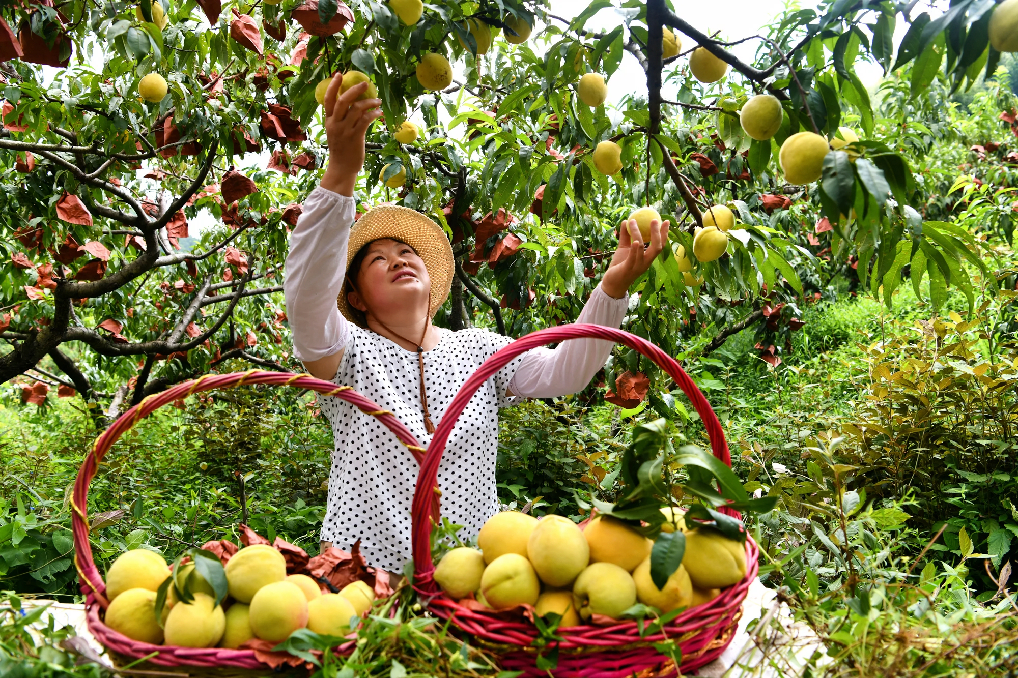 “这批黄桃糖度达到15度,刚发朋友圈就有老客户下单了。”基地负责人刘储兴托着套袋黄桃向游客展示。2018年,科技能人刘益芳看中当地昼夜温差大、光照充足的气候特点,带领村民发展高山黄桃、黄冠梨、茶叶等产业。通过“支部+合作社+基地+农户”模式,整合分散土地资源,引进“锦绣黄桃”、黄冠梨等优质品种,采用幼果套袋、生物防虫等绿色种植技术,让昔日的荒山坡变成“花果山”。
