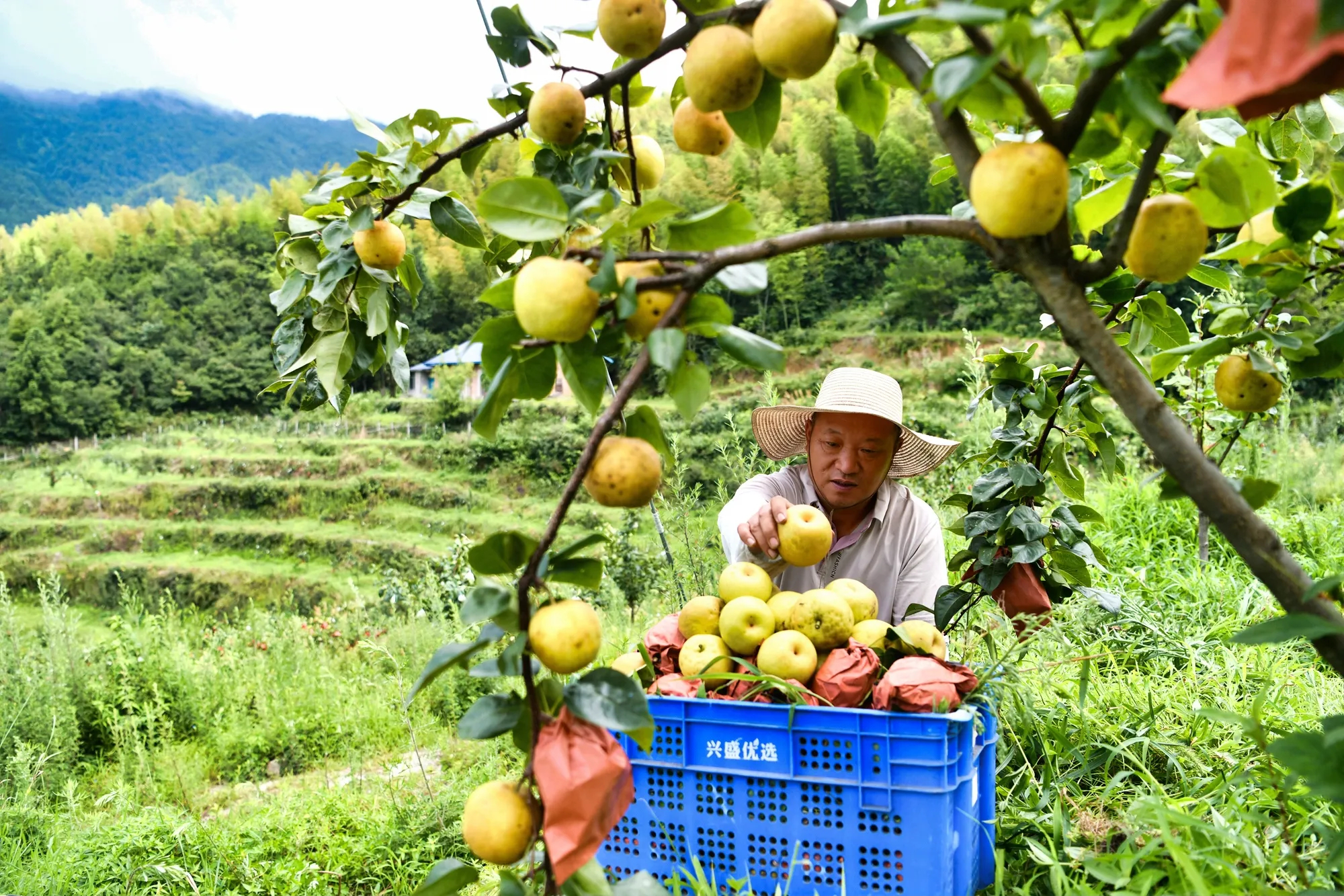 2025年7月28日,在幕阜山通城黄龙山风景区大坳百合村高山生态果园,果农在采摘黄冠梨。