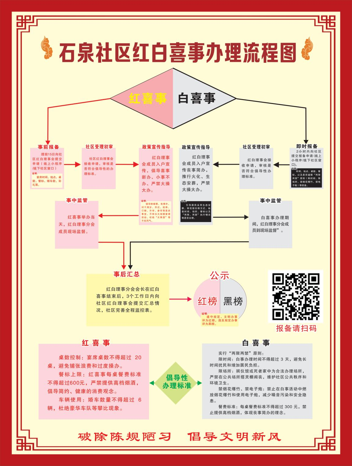 同时,社区制作了红白喜事流程图,居民代表集体讨论并举手表决了修订的居民公约,发放了移风易俗倡议书、签订了严禁大操大办婚丧喜庆事宜承诺书。隽水镇党委宣传委员黎平同志作为移风易俗理论政策宣讲员,选取了身边的真实案例进行了生动地讲述,通过这些看得到、听得见、学得到的例子,让社区居民对婚事新办、厚养薄葬等新风尚的意义有了更真切的体会。