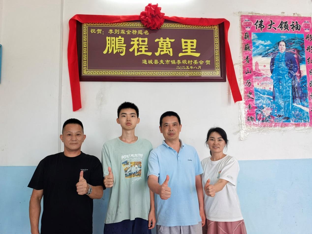 上午11时,红底金字的“鹏程万里”牌匾在村民的簇拥与祝福声中抵达李家。村支书李林在赠匾仪式上高度赞扬李则霖:“金榜题名,是他寒窗苦读的回响,更是我们全村的荣光!期待他在哈工大这片沃土上展翅高飞,未来以真才实学报效国家,为家乡增辉添彩。”这位理科尖子生凭借高度的自律,在高考压力下始终稳扎稳打,最终叩开梦想学府的大门。面对未来,李则霖满怀感恩:“哈工大是我心之所向,今日梦圆,万分感激父母养育与乡亲厚爱。前路漫漫,我定当加倍努力,以所学回馈社会。”