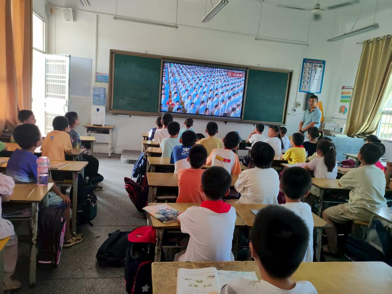 上午9时,阅兵仪式正式开始,学生们整齐地坐在教室里,目光紧紧地盯着大屏幕。当嘹亮的国歌响起,全体学生自发地起立,共同高唱国歌,歌声响彻校园。