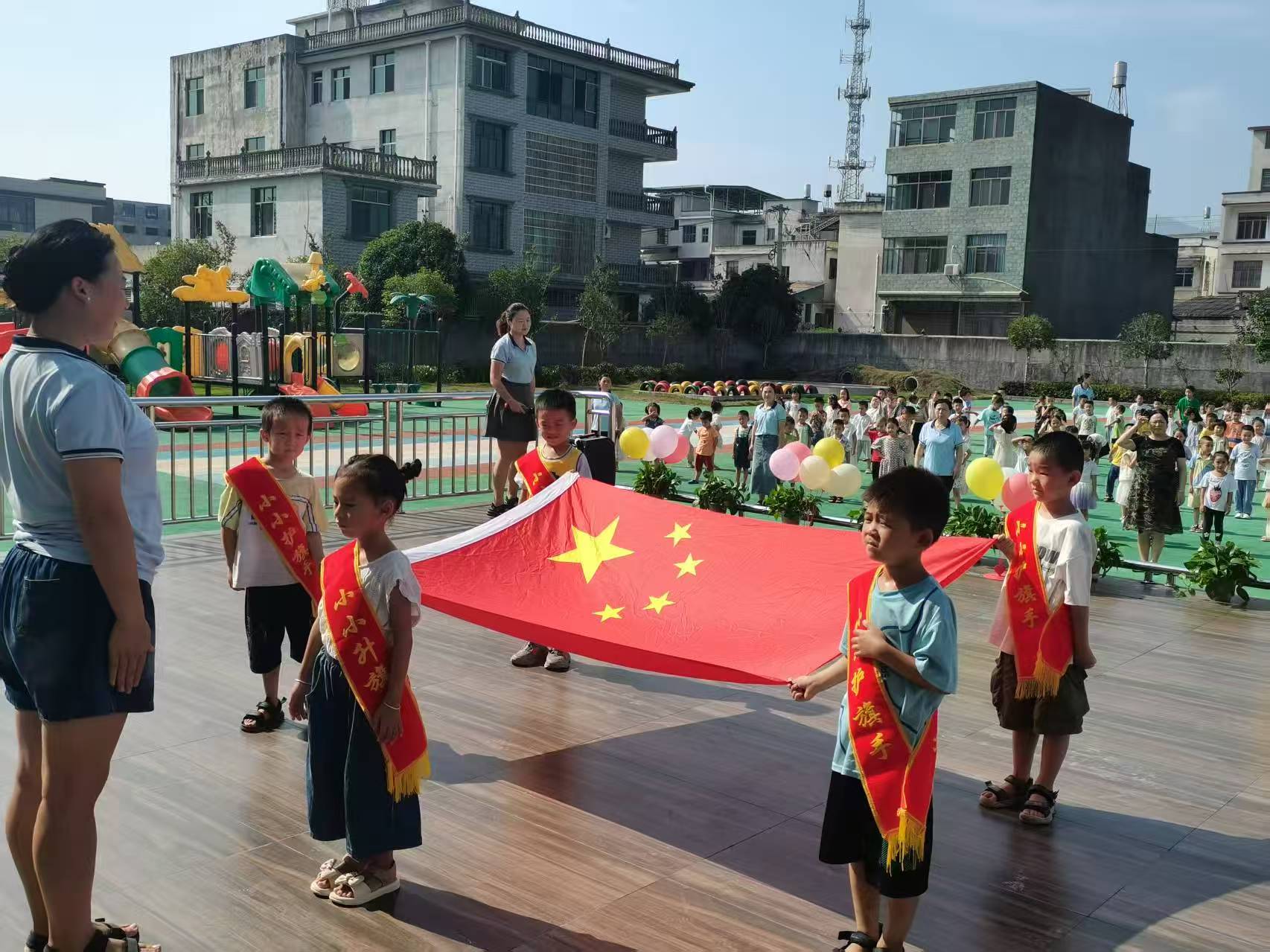 升国旗,唱国歌。鲜艳的五星红旗如炽热的火焰,在金灿灿的阳光下熠熠生辉。大班的小小护旗手们迈着整齐坚定的步伐,昂首挺胸、精神抖擞地走向升旗台。他们目光稚嫩却庄重,无不流露着作为国旗护卫队员的荣耀与自豪。