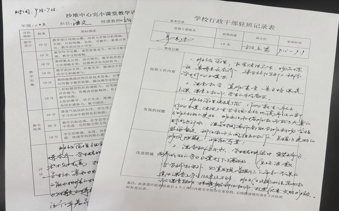 围绕教学常规,驻班干部严格落实教学方案要求。检查102 班科任教师教案,重点核查教学目标是否明确、教学过程是否符合学生认知、教学反思是否有改进性,对数学教案“习题缺乏分层”问题现场沟通优化;随机抽30 份学生作业,从批改及时性、准确性、反馈指导性及订正完成度核查;列席班级科任教师参与的数学教研组活动,记录“低年级数学趣味教学”研讨内容,掌握教研动态。