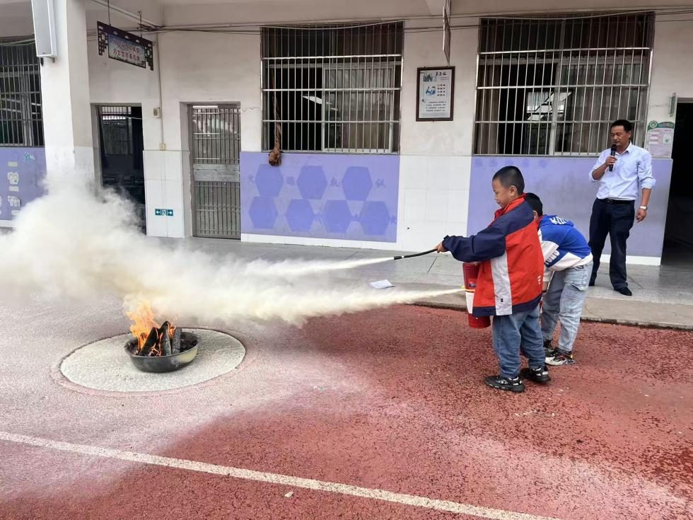 上午9 时,校园消防警报响起,各岗位老师迅速到岗指挥,学生在班主任带领下,以湿毛巾捂住口鼻、弯腰低姿的方式,沿预设路线有序撤离教学楼,成功达到预期效果。演练结束后,校长为全体师生开展消防安全知识课,讲解火灾危害、预防要点及火灾应对方法,同时还进行了灭火器实操教学,现场传授了“一提、二拔、三握、四压”的使用口诀。