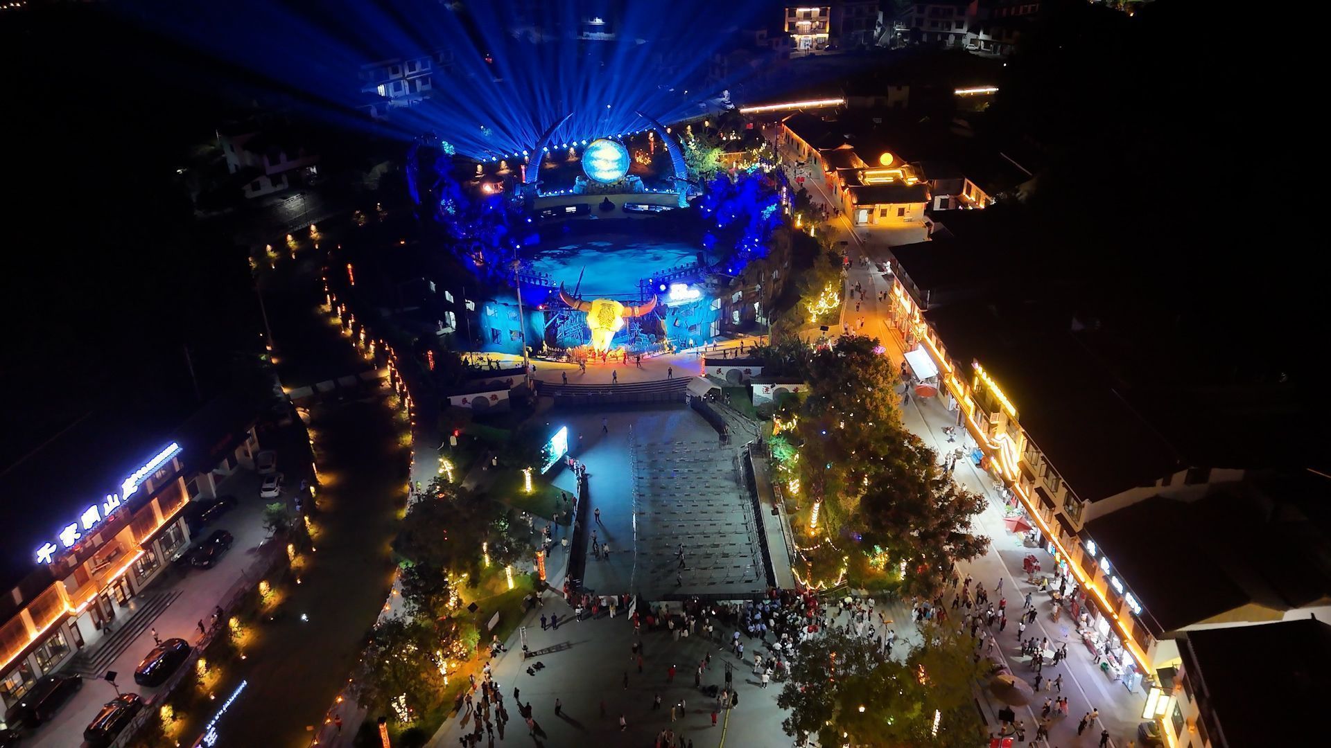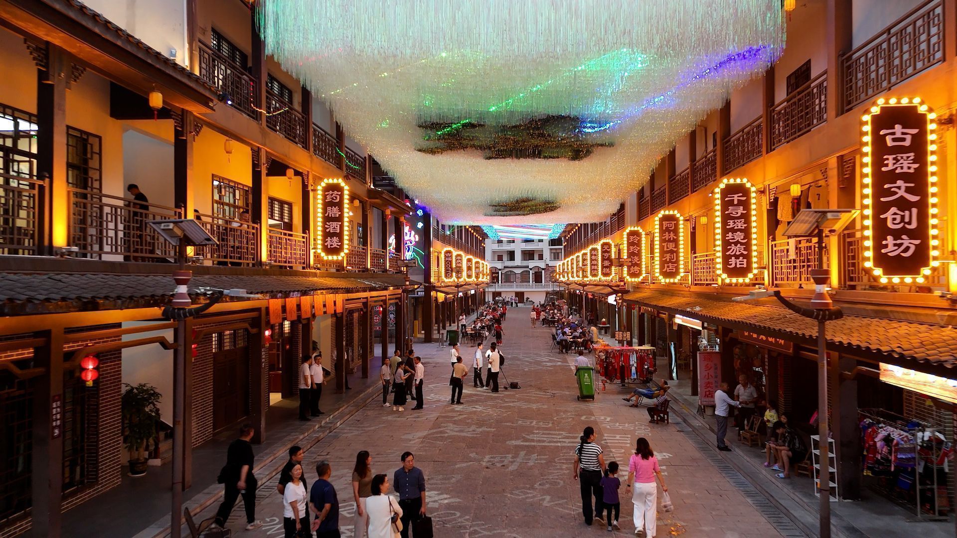 从震撼的演艺现场移步至瑶乡古街,又是另一番景象。白天的古街,游客可体验瑶族快闪、品尝地道小吃。夜幕降临时,激光灯带、雾森系统与星空天幕将古街装扮得如梦似幻。游客们逛古街、购特产、赏夜景,烟火气十足。