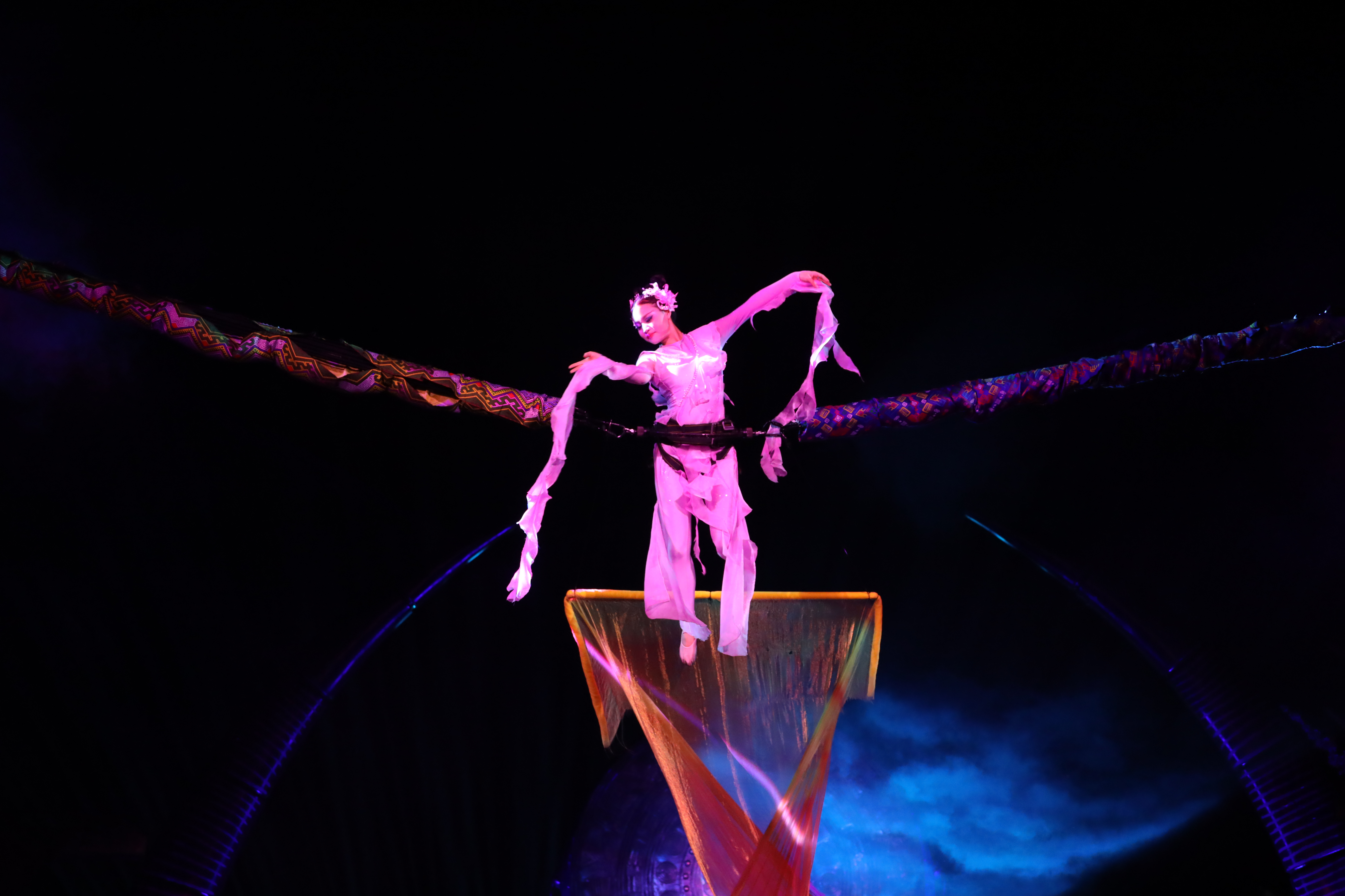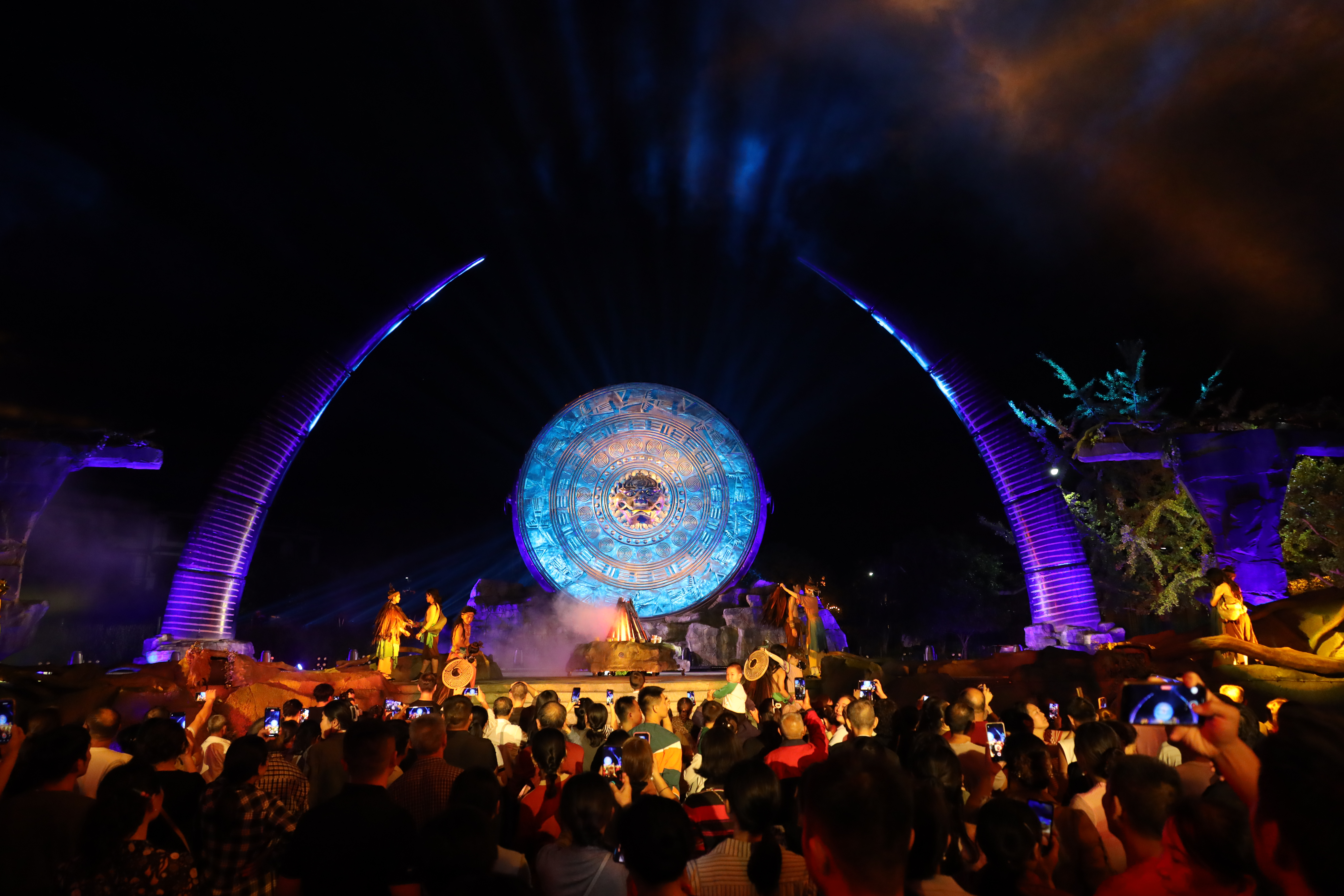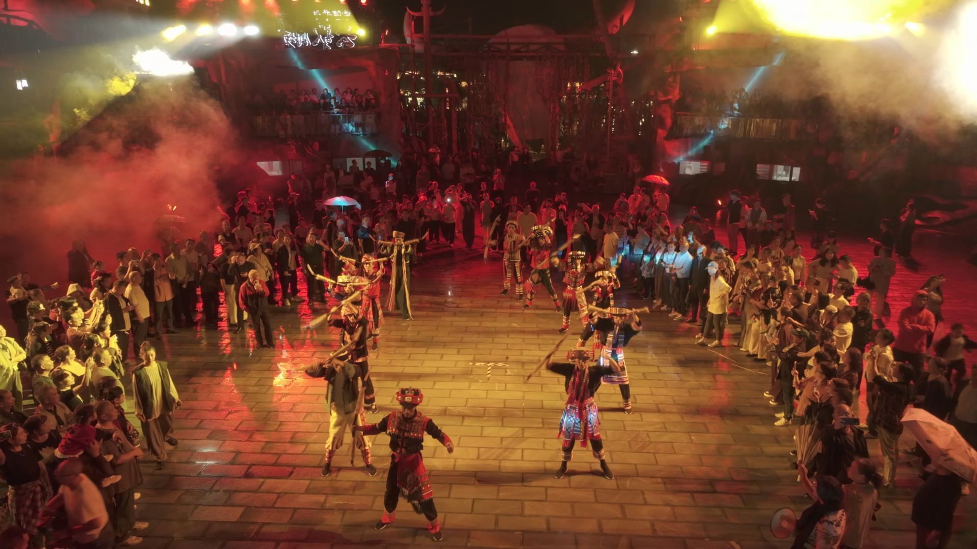 铜鼓擂响,从广场四周汇聚而来的游客在环形立体舞台共同见证了大型沉浸式民族史诗《瑶望千年·云歌》的首演。作为此次改造升级的核心,演出以歌声为引、光影为笔,借助5D声场灯光与水幕火环特效,在山水实景间展开一幅瑶族迁徙的壮丽画卷。观众置身其间,仿佛亲历那段波澜壮阔的岁月。