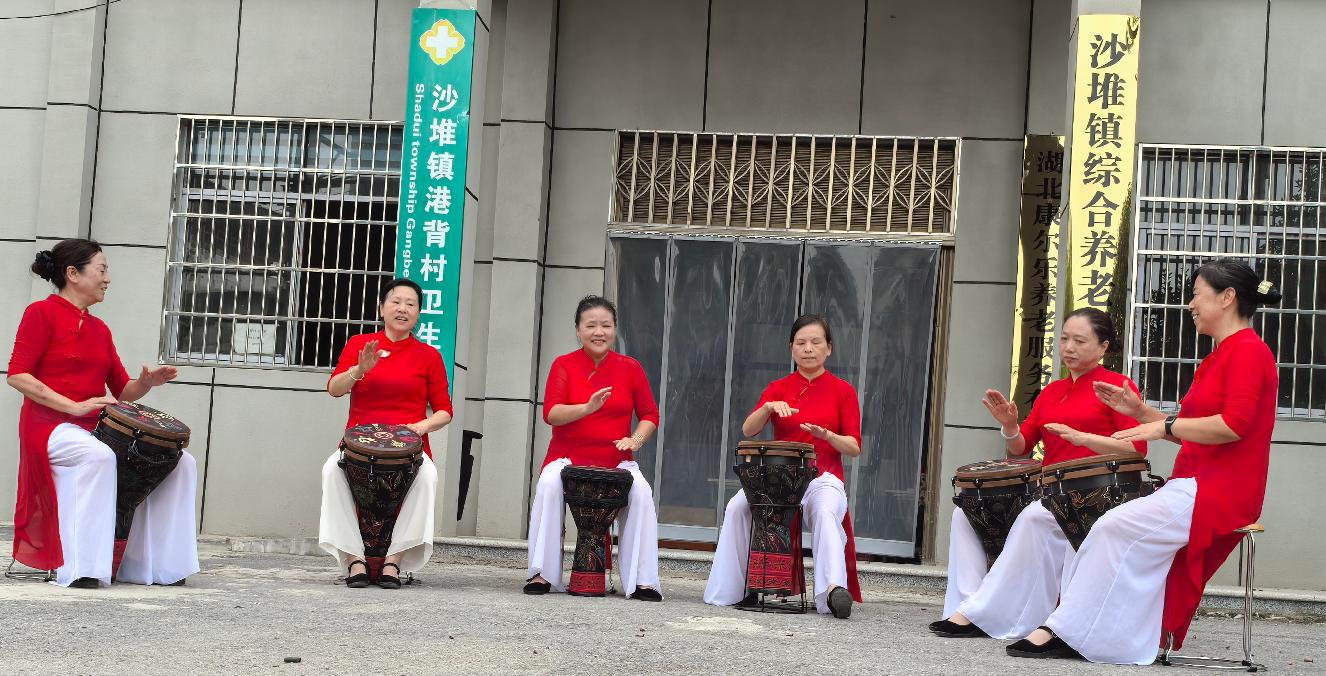 非洲鼓表演时,参与者身着红装白裤,在沙堆镇综合养老服务中心 “尊老为德、敬老为善、爱老为美、助老为乐” 的文化氛围中,节奏明快的鼓点传递出热烈的节日情绪,瞬间点燃现场气氛;