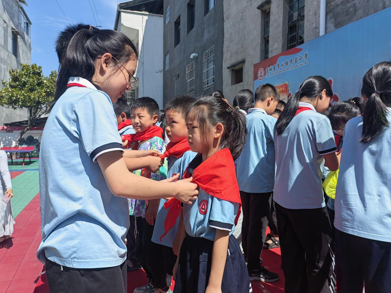 在热烈的气氛中,大队辅导员宣读了入队决定。紧接着,老队员们双手托着鲜艳的红领巾,郑重地为新队员佩戴。当红领巾在胸前飘扬时,新队员的脸上洋溢着激动与骄傲。