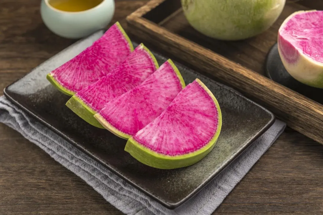 心里美萝卜清脆爽口,常用于凉拌,需要注意的是,花青素在酸性条件下稳定,因此凉拌时最好加点醋。