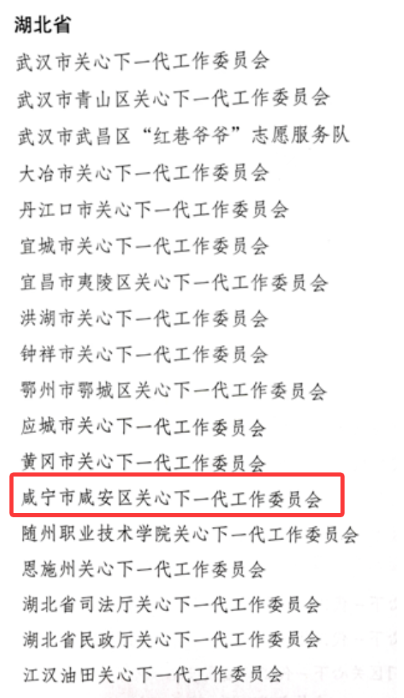 近年来,咸安区关工委在青少年中积极开展铸牢思想根基、传承红色基因、加强权益保护、深化关爱助学和优化社会环境等五大工程,在全区所有乡镇办事处建立关心下一代组织,做到领导、人员、阵地、经费、活动五到位,形成了“党委统一领导、党政齐抓共管、关工委主动作为、有关部门积极配合、社会各界广泛参与”的关心下一代工作机制,充分发挥了中心城区的示范引领作用。