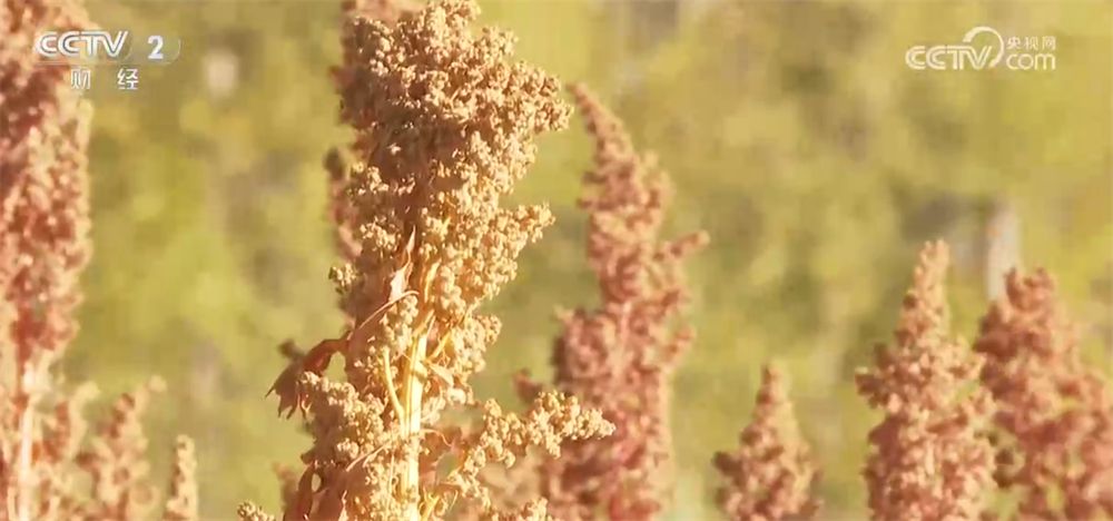 记者来到了青海省海西蒙古族藏族自治州乌兰县的一块藜麦标准化种植示范基地,这里地处柴达木盆地腹地,平均海拔在3000米左右,这里的万亩藜麦已经成熟。远远望去,成熟的麦穗如同一片火红、金黄、紫红等颜色相间的藜麦海洋,整块田地更宛如一幅天然油画,美不胜收。大家可以看到,成熟的藜麦最高能够达到2米多。藜麦成熟后的籽粒对水分十分敏感,遇水2小时就会发芽,失去商业价值。而柴达木盆地独特的自然、气候和生态环境能够让藜麦始终保持一个干燥的状态,这里也是青海的藜麦最佳种植区。