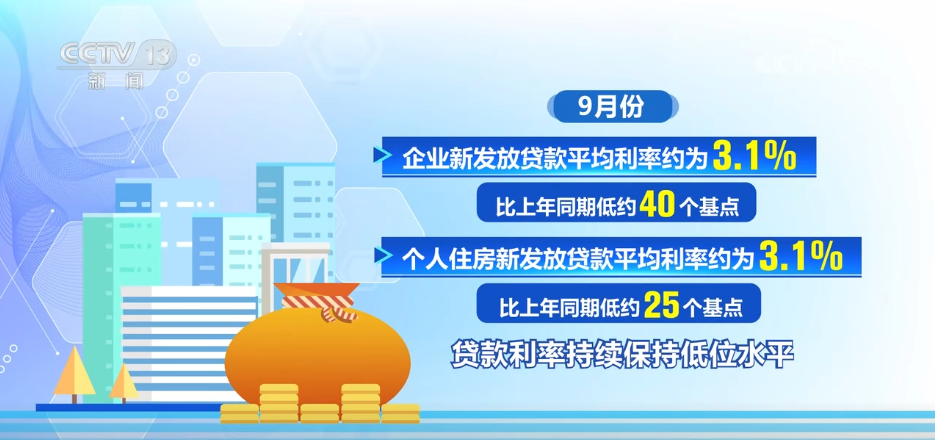 9月份,企业新发放贷款平均利率约为3.1%,比上年同期低约40个基点;个人住房新发放贷款平均利率约为3.1%,比上年同期低约25个基点,贷款利率持续保持低位水平。