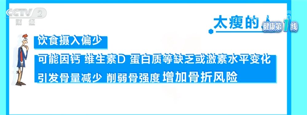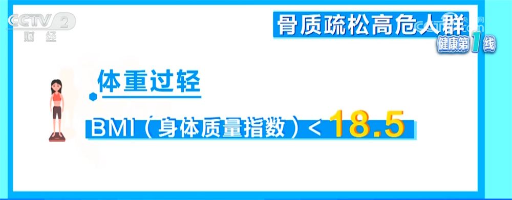 如果体重过轻,特别是身体质量指数也就是BMI低于18.5的时候,很可能成为骨质疏松的高危人群。太瘦的人往往饮食摄入偏少,可能因钙、维生素D、蛋白质等缺乏或激素水平变化引发骨量减少,削弱骨强度,增加骨折风险。