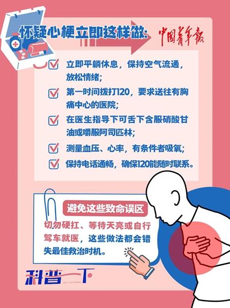 医生建议,日常守护,可以从生活细节保护血管健康做起。如果突感心脏不适,在就医前可以这样自救:保持镇静,第一时间拨打120急救电话;在等待救援过程中,尽量躺下休息,降低心脏负荷;如有检测设备,可监测血压、脉搏和血氧,为医生提供参考;对于已确诊的患者,可尝试使用医生认可的药物缓解症状,但要注意用药安全;如突发意识障碍,在呼叫救援的同时,应立即展开有效的心肺复苏。