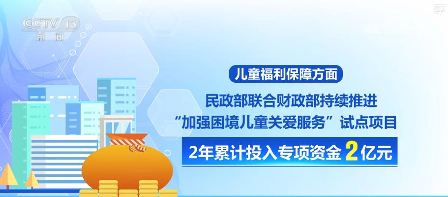 儿童福利保障方面,民政部联合财政部持续推进“加强困境儿童关爱服务”试点项目,2年累计投入专项资金2亿元。