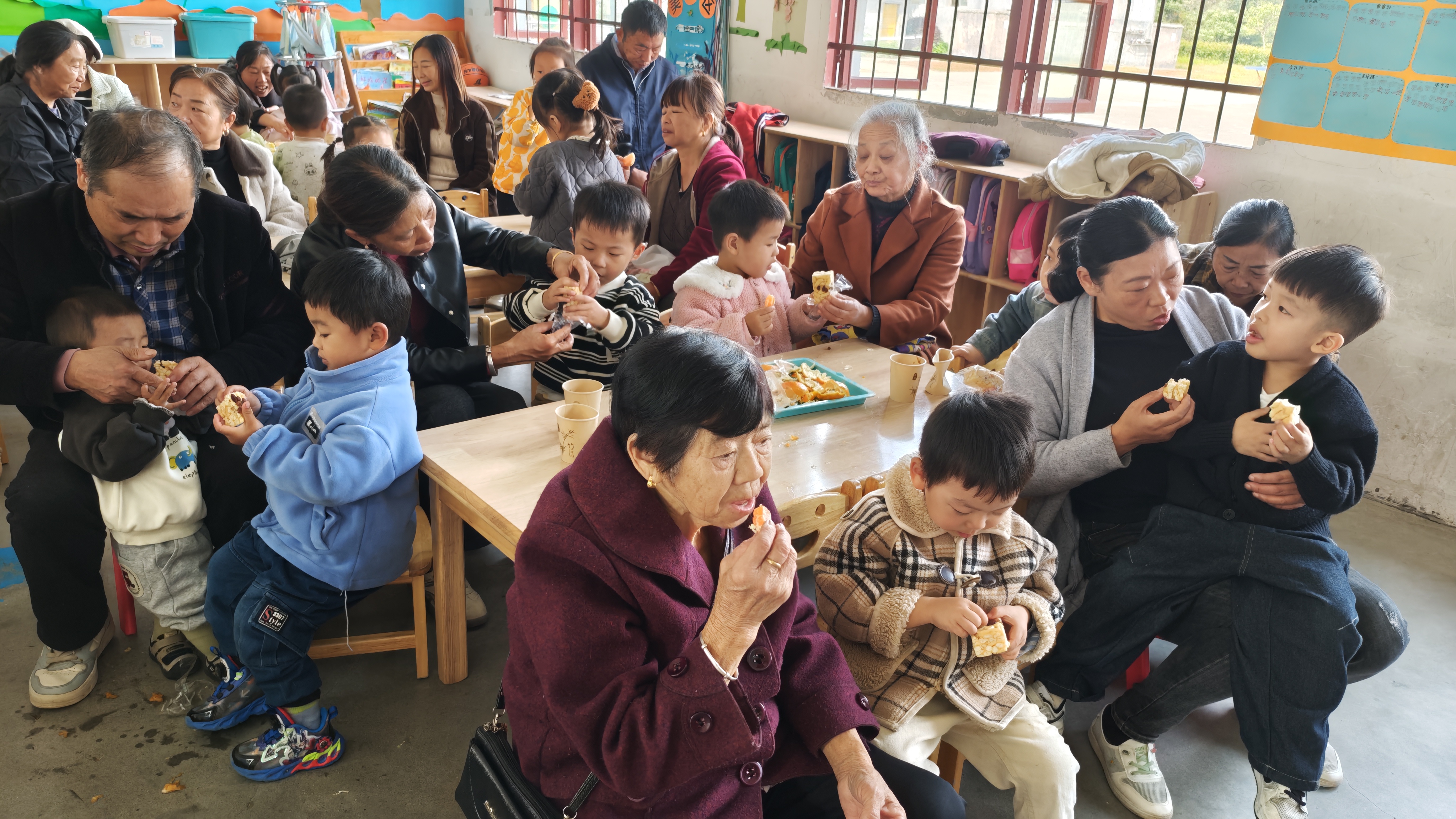 活动现场暖意融融,孩子们化身“小小孝亲使者”,用稚嫩的行动传递真挚的爱意。他们精心准备了节目,或唱或跳,认真的模样赢得爷爷奶奶们阵阵掌声;表演结束后,孩子们主动上前,为爷爷奶奶捶背揉肩,动作虽略显笨拙,却饱含心意;有的端来温热的茶水,有的细心剥好橘子喂到长辈嘴边,还有的分享着心爱的零食,一举一动都充满童真与温暖。