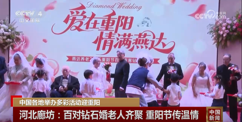 在河北廊坊一家养老机构的活动现场,一百对钻石婚长者身着婚纱礼服,携手步入会场,在亲友和嘉宾的见证下,通过“走红毯”“交换戒指”“颁发钻石婚纪念证书”等环节,完成庆典仪式。现场掌声不断,温情涌动。