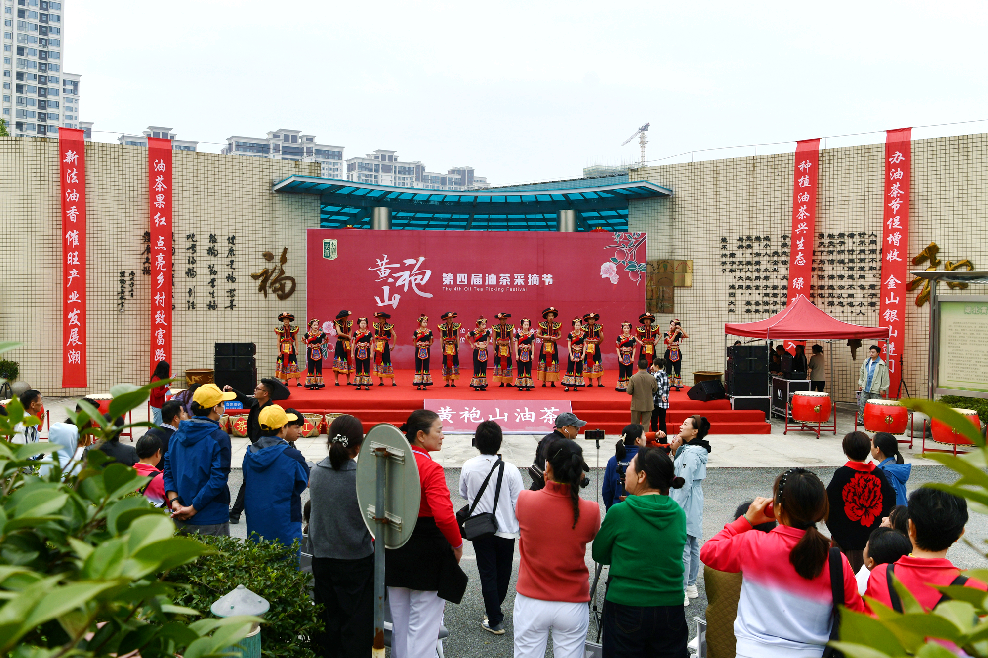 节庆活动现场,写有“油茶果红点亮乡村致富路”的标语迎风招展,省级非物质文化遗产拍打舞的铿锵节奏与《油茶花开》的悠扬旋律交织回荡。