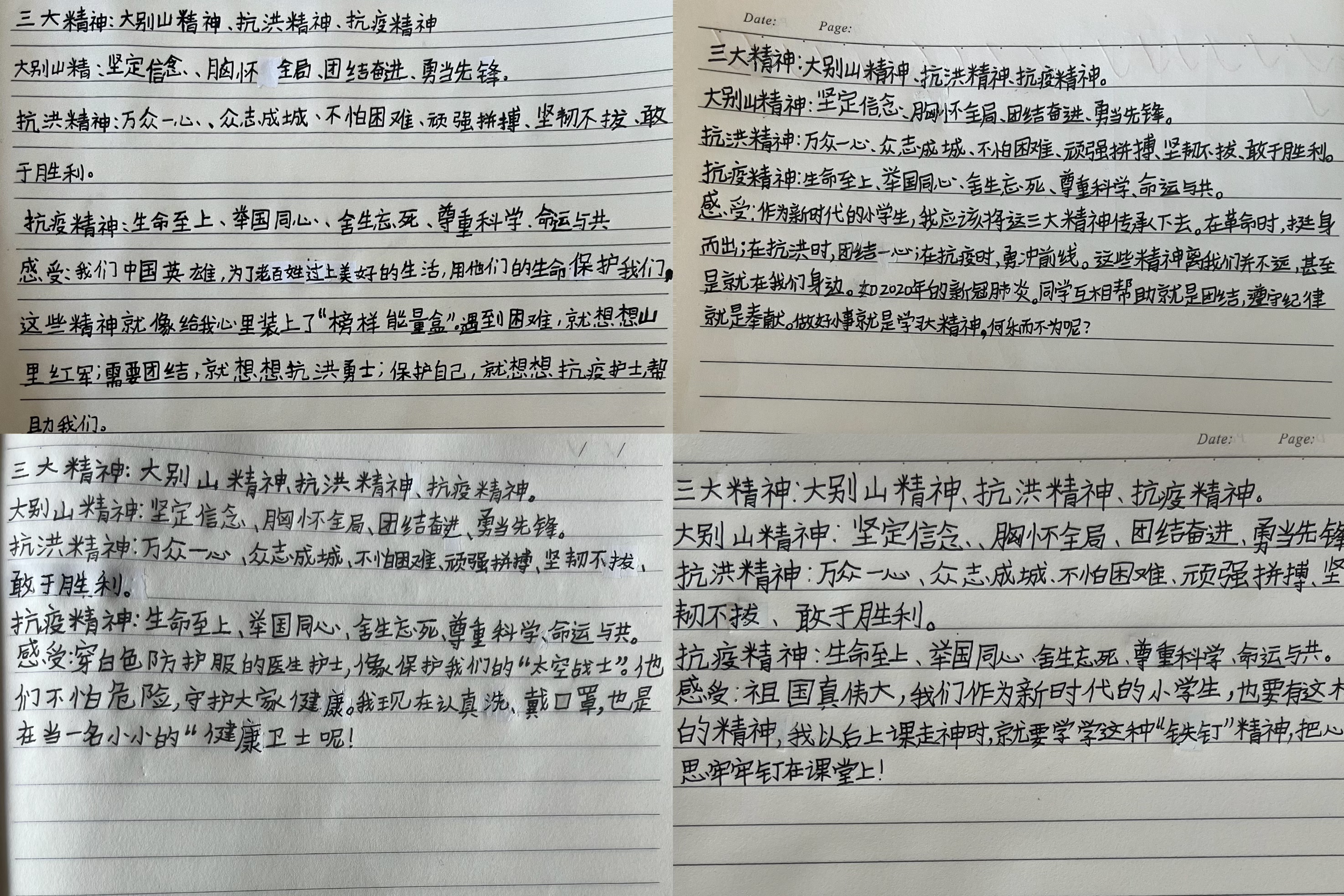 活动的最后,同学们拿起笔,将自己的所思所感倾注于笔端。一行行工整的字迹,一句句真挚的话语,记录下了他们的收获与成长。有的同学写道:“我要学习抗洪叔叔的团结精神,和同学们一起克服所有困难。”还有的写道:“我要像抗疫医生一样负责任,从认真完成每一次作业做起。”通过书写感想,伟大的精神从遥远的故事中,化为了孩子们日常行为的准则,社会主义核心价值观在他们心中牢牢扎根。