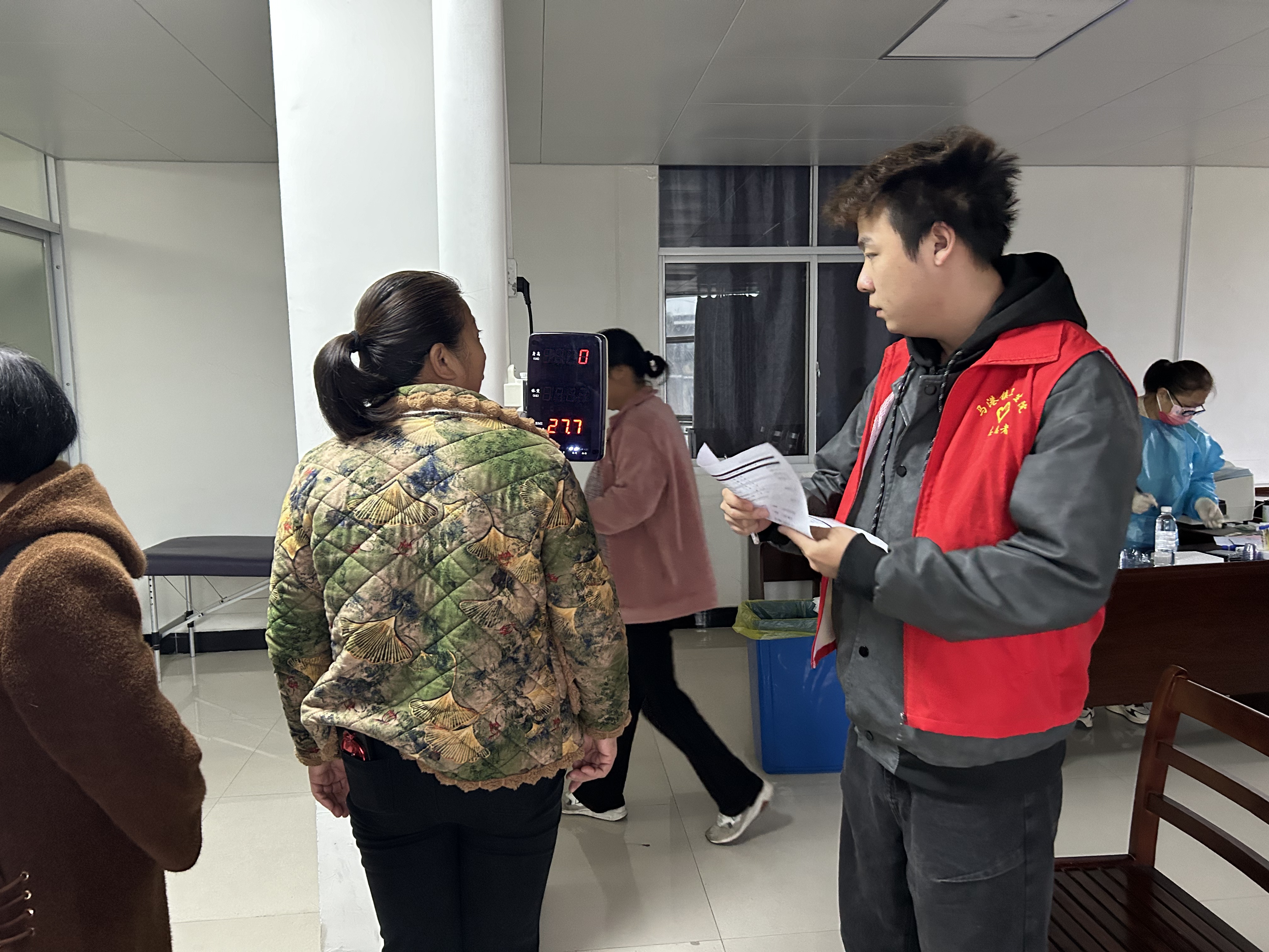 活动现场秩序井然,医疗志愿者在各检查区高效忙碌。抽血区里,志愿者轻声安抚紧张的老人;身高体重区,志愿者搀扶老人上下检测台。刚测完血压的李奶奶问道:“我血压是不是又高了?最近总头晕。”医护人员核对数值后回应:“是有点偏高,记得按时吃药,下周复测一下。”