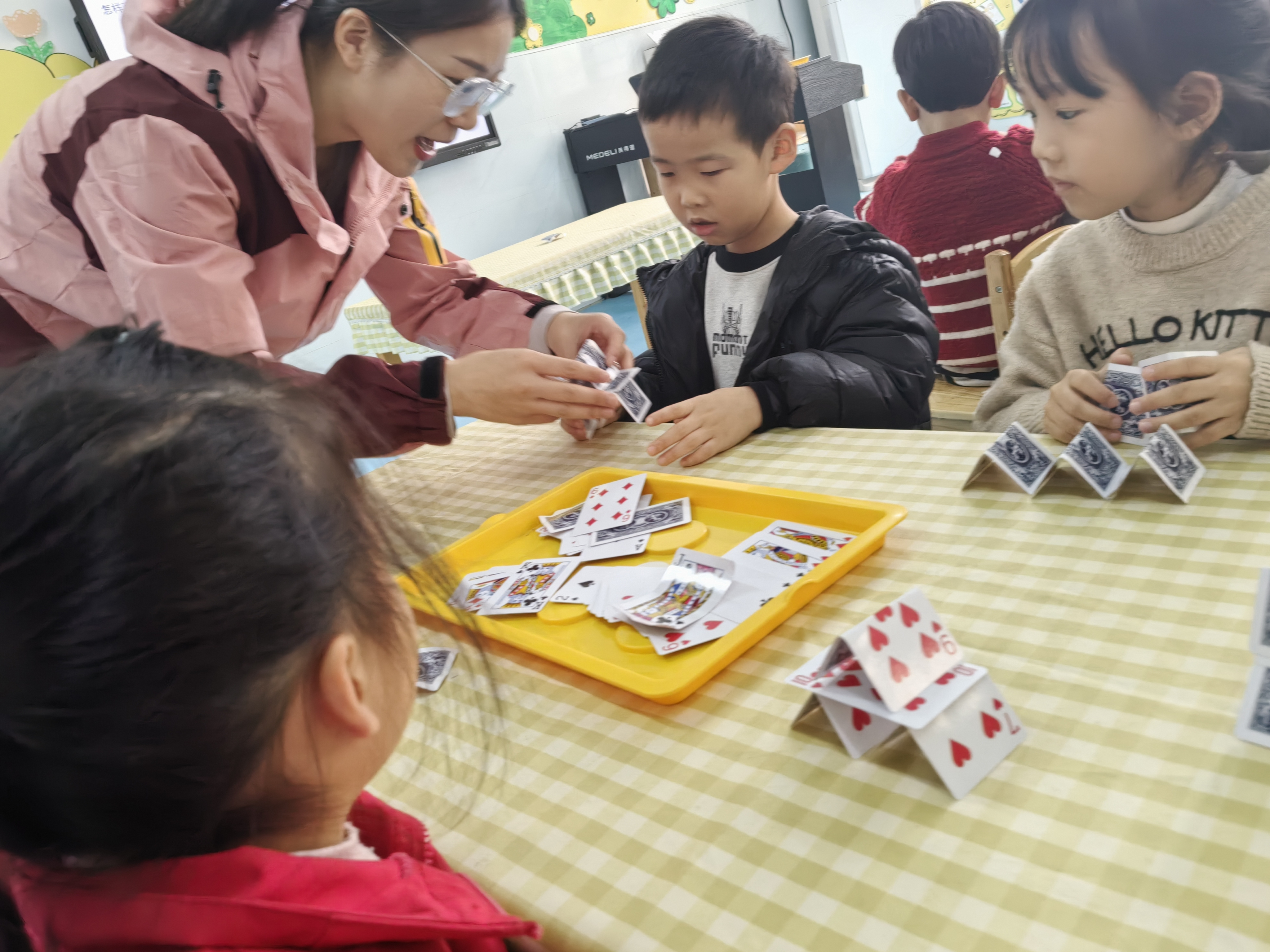 活动中,各班教师根据幼儿的年龄特点和发展水平,精心设计了一系列富有童趣和教育意义的游戏活动。例如,在中班的奥尔夫音乐游戏中,通过律动、即兴创作等游戏化互动,让孩子们在轻松氛围中掌握节奏、韵律、集体协作等音乐元素,激发其创造力和参与兴趣。而在大班科学探索游戏《纸牌建筑师》中,孩子们则化身为小小建筑师,他们运用折叠、卷曲等方式改变纸张的形状,分工合作、共同探索房子的稳定性与结构。在一次次尝试与改进中,不仅锻炼了手眼协调能力和空间想象力,更培养了坚持与合作的良好品质。