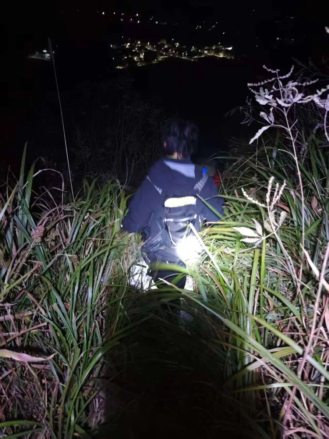 经过近3小时紧张搜救,21时许,救援队伍行进至山腰一处避风岩石旁时,终于听到回应。循声望去,只见魏先生蜷缩在岩石边,因眼镜不慎掉落,在黑暗中寸步难行。看到救援人员的身影,他激动得热泪盈眶。