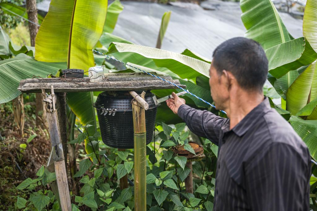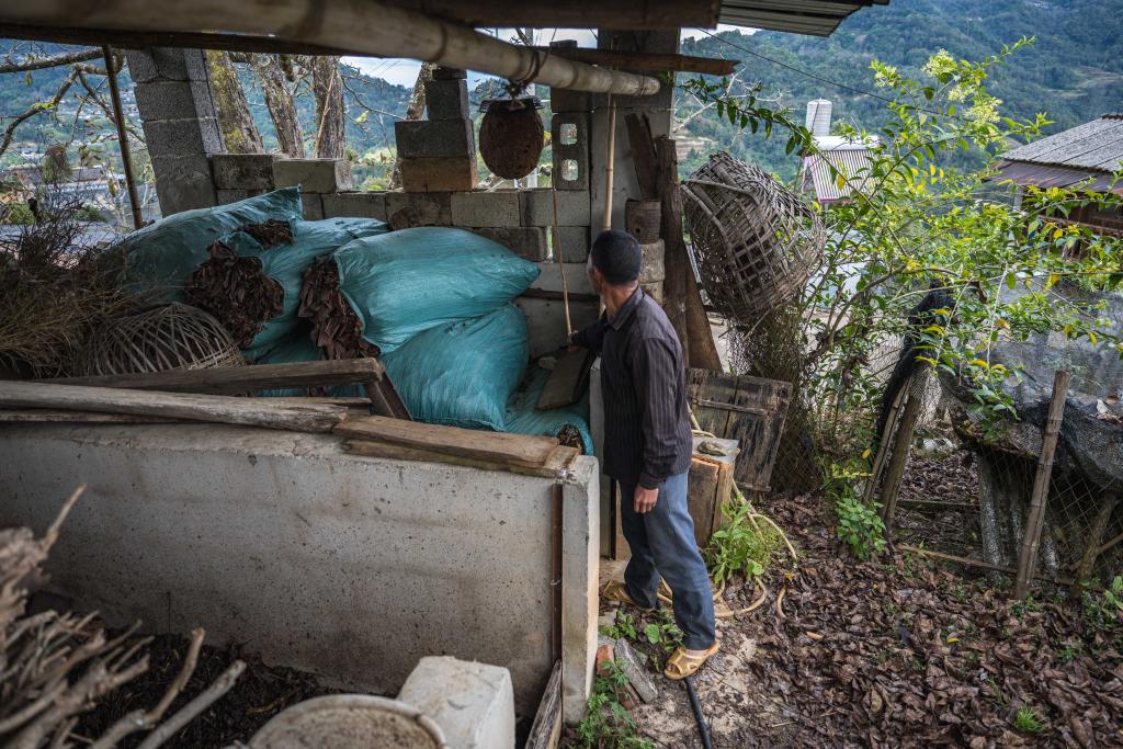 11月19日,在云南省保山市龙陵县龙山镇河头村,一名村民查看养殖的胡蜂。
