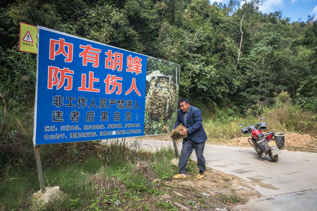 11月19日,在云南省保山市龙陵县龙山镇,龙陵县黄氏蜂业有限公司工作人员在检查警示牌。