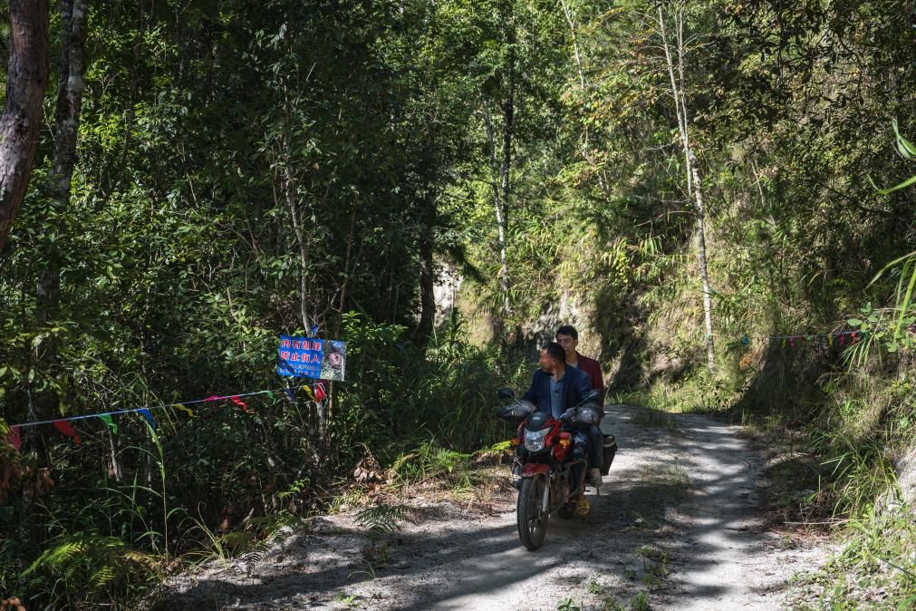 11月19日,在云南省保山市龙陵县龙山镇,龙陵县黄氏蜂业有限公司工作人员骑车经过一处警示标志。