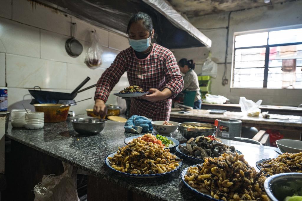 11月19日,云南省保山市龙陵县龙山镇一家餐馆工作人员在制作菜品炸胡蜂蛹。