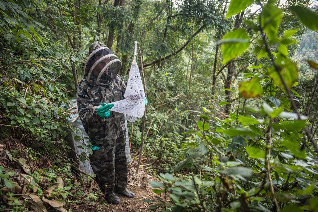 11月19日,在云南省保山市龙陵县龙山镇河头村,一名村民查看野外收集的胡蜂。