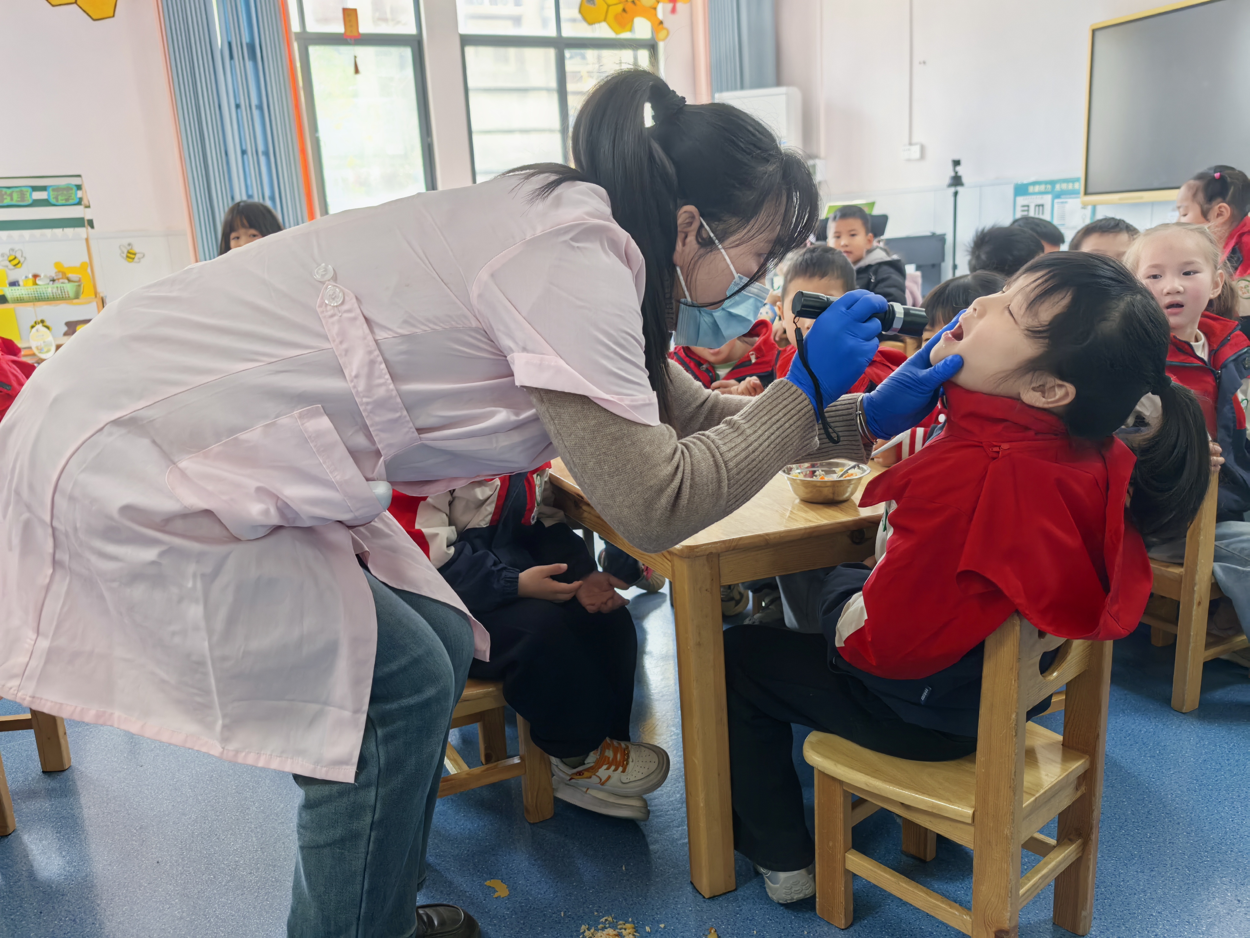 随后,保育教师穿上防护装备,开窗通风,对幼儿的呕吐物进行了专业的封存、消杀处理,防止病菌的扩散传播。