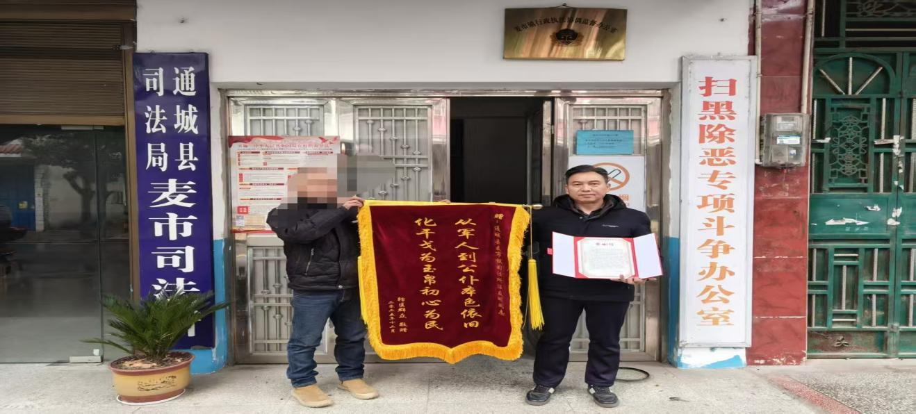 【通讯员 葛林艳】近日,通城县麦市镇成功调解一起长达28年的家庭房产继承纠纷。村民葛某将一面印有“从军人到公仆本色依旧,化干戈为玉帛初心为民”的锦旗送到了麦市镇司法所,对司法所的工作人员表示感谢。