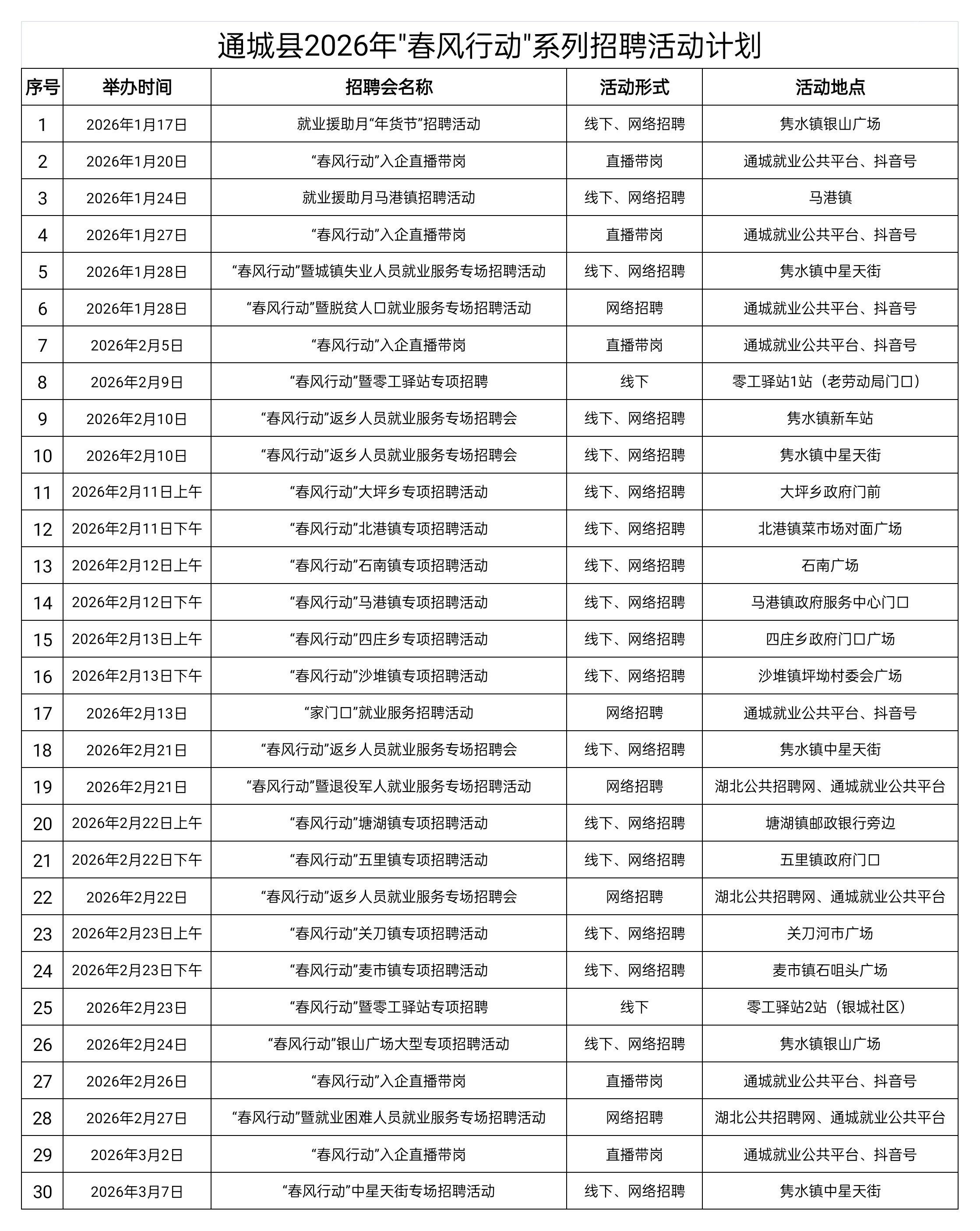 通城县2026年“春风行动”系列招聘活动计划