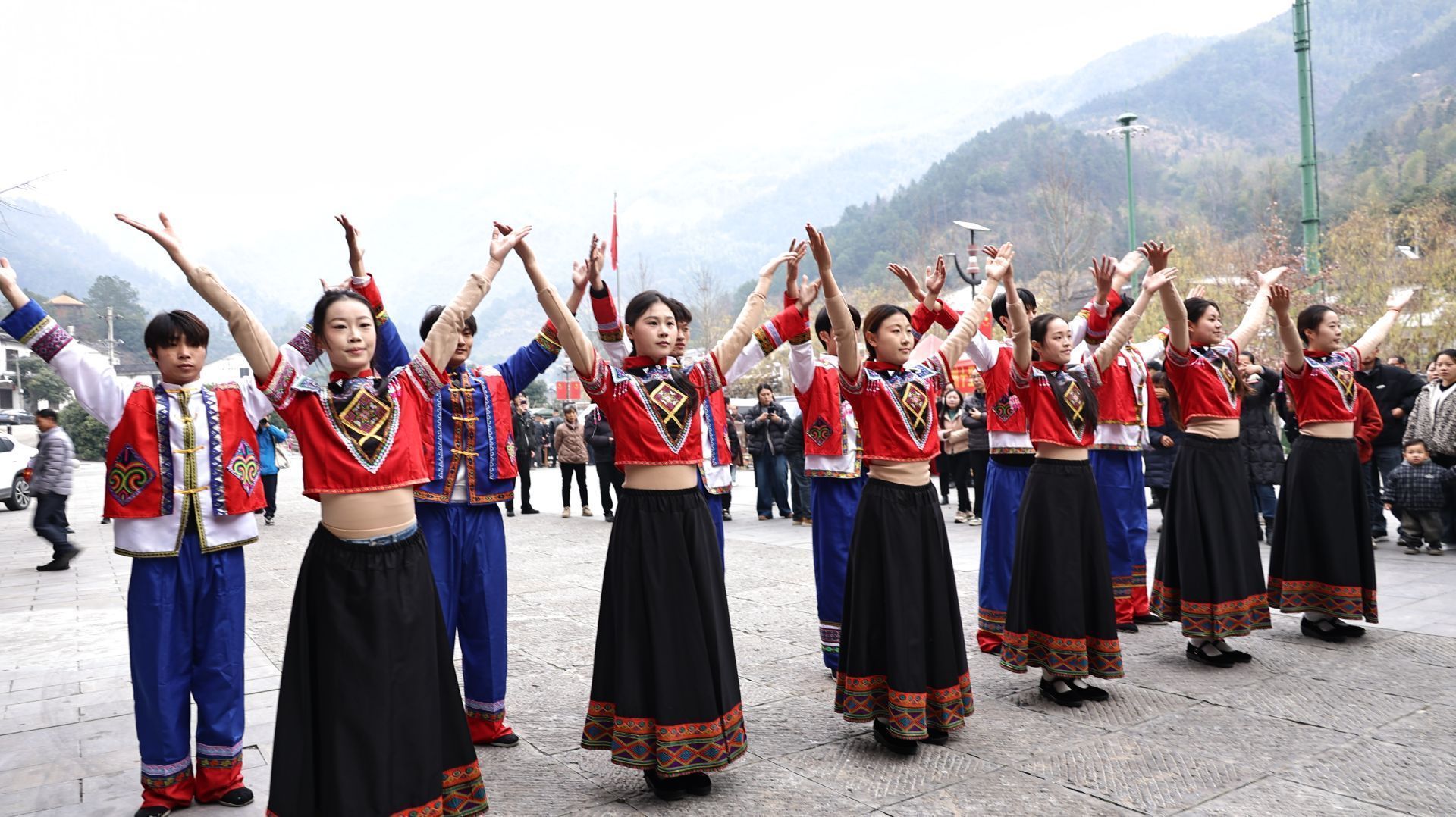 民俗展演环节,瑶族拍手舞率先登场。演员们踏着明快节拍击掌而歌,瞬间点燃全场气氛,台下游客深受感染,纷纷起身与舞者手拉手共舞,欢声笑语与明快节拍交织在一起。随后,游客们纷纷加入趣味十足的跳竹竿表演队伍中,跟着竹竿开合的节奏跃动,喝彩声此起彼伏。