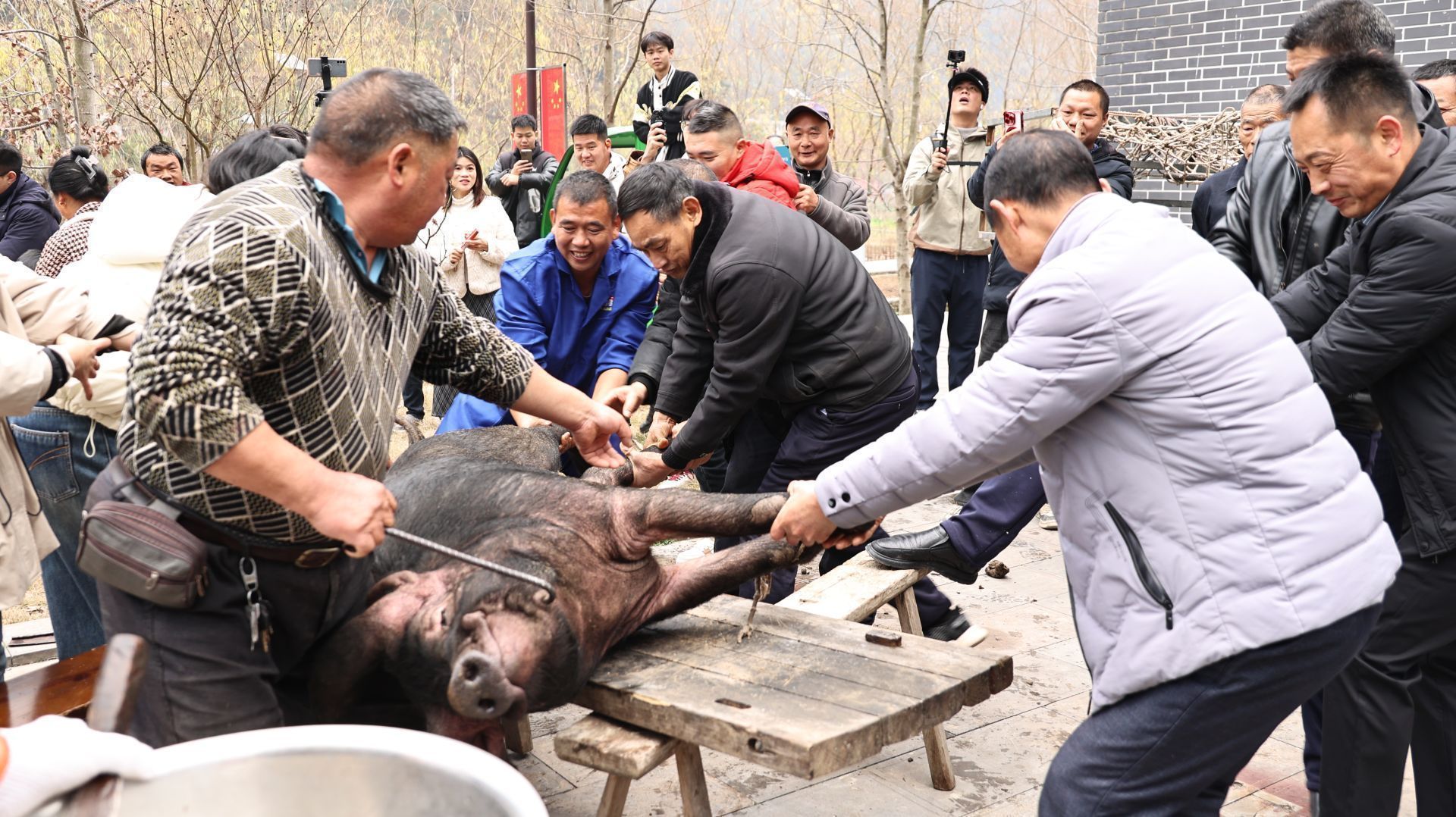 活动现场热闹非凡,年味扑面而来。上午10点,“赶年猪”仪式正式拉开序幕,村民与游客合力抬着肥硕的年猪。不少游客按捺不住热情,纷纷主动加入“按猪脚”的行列,沉浸式体验这一传统习俗,现场欢声笑语交织,热闹的氛围感染着在场的每一个人。