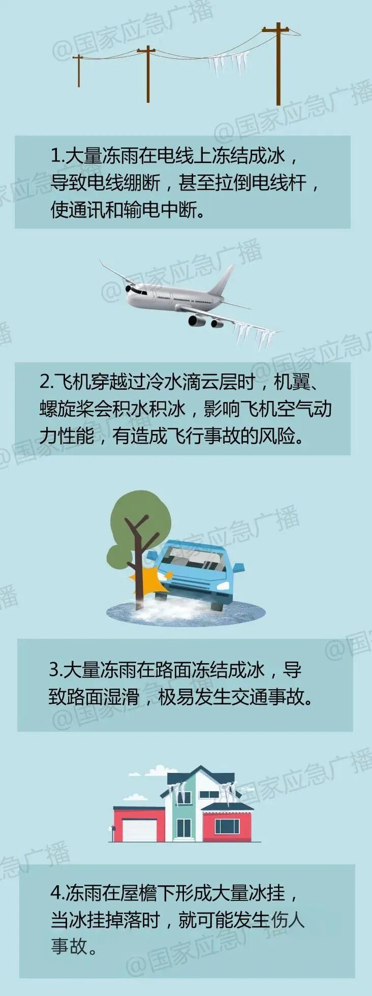 冻雨会在电线上冻结成冰,冰本身的重量加上风力的作用,电线极易绷断甚至拉倒电线杆,出行时一定远离电线杆、树木、有冰挂的屋檐等。