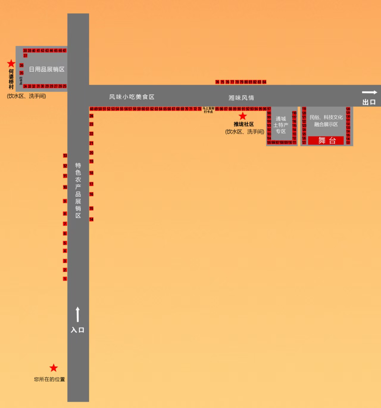 在推垅社区党群服务中心至中天广场两侧,设置标准化展位25个,集中展示湖南省岳阳市平江县上塔市镇、板江乡以及岳阳县月田镇特色农特产品、文旅资源等(其中平江县花灯戏在会场主舞台展示),宣传推介湘鄂边镇的自然风情、旅游景点、人文特色等,强化湘鄂边镇交流、交往、交融。