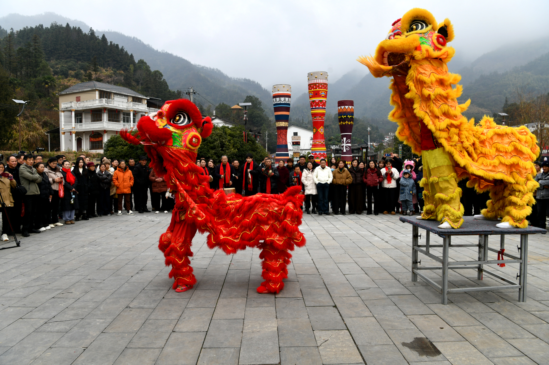 2026年1月27日,游客在湖北省咸宁市通城县药姑山古瑶村景区观看舞狮表演。