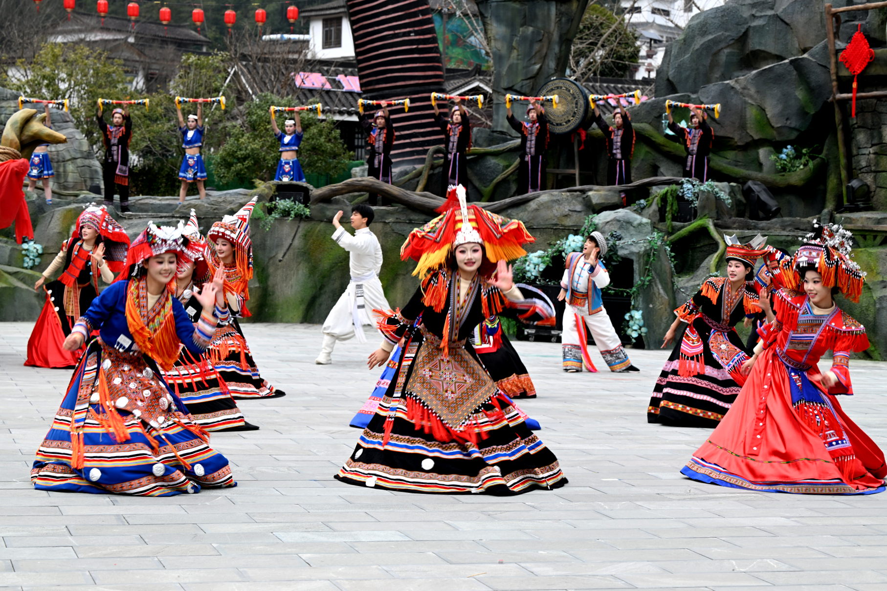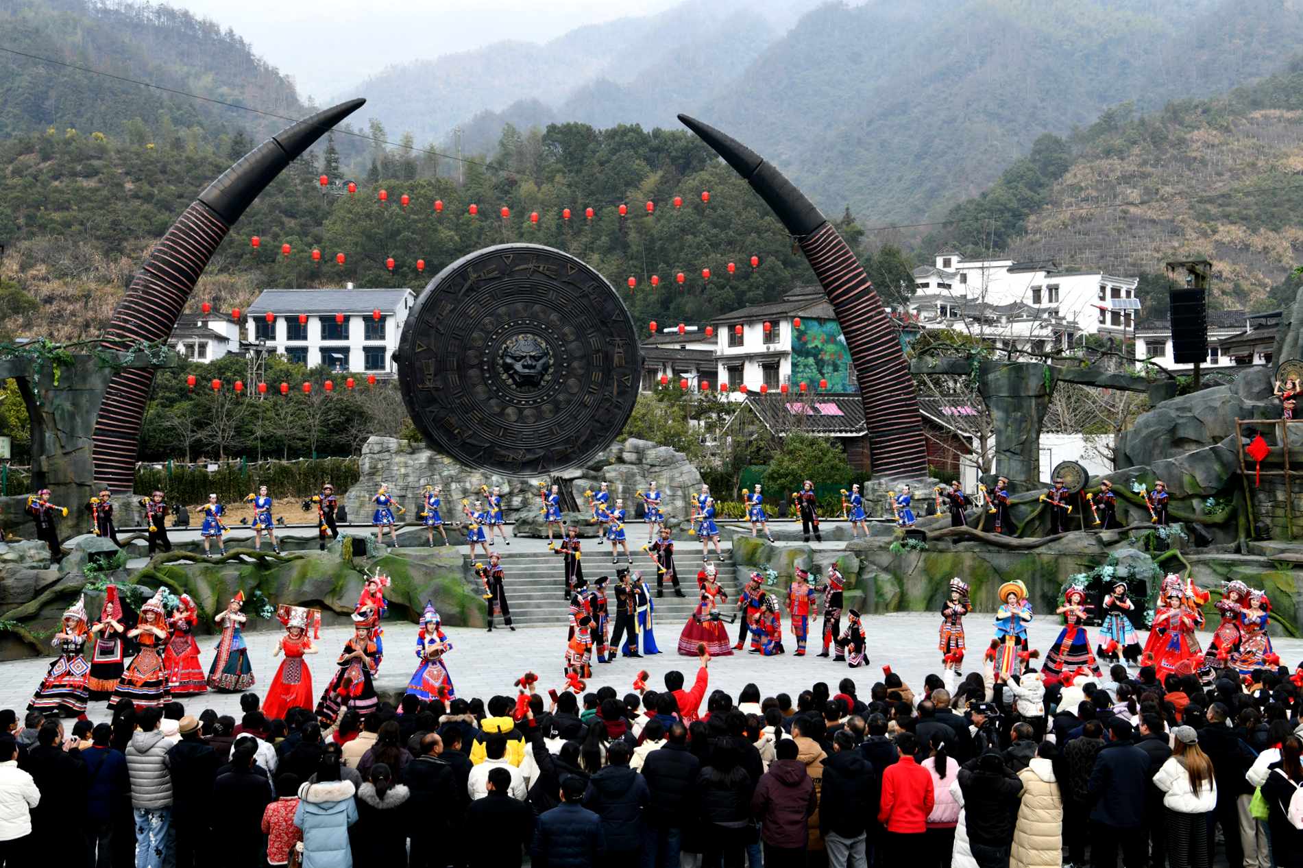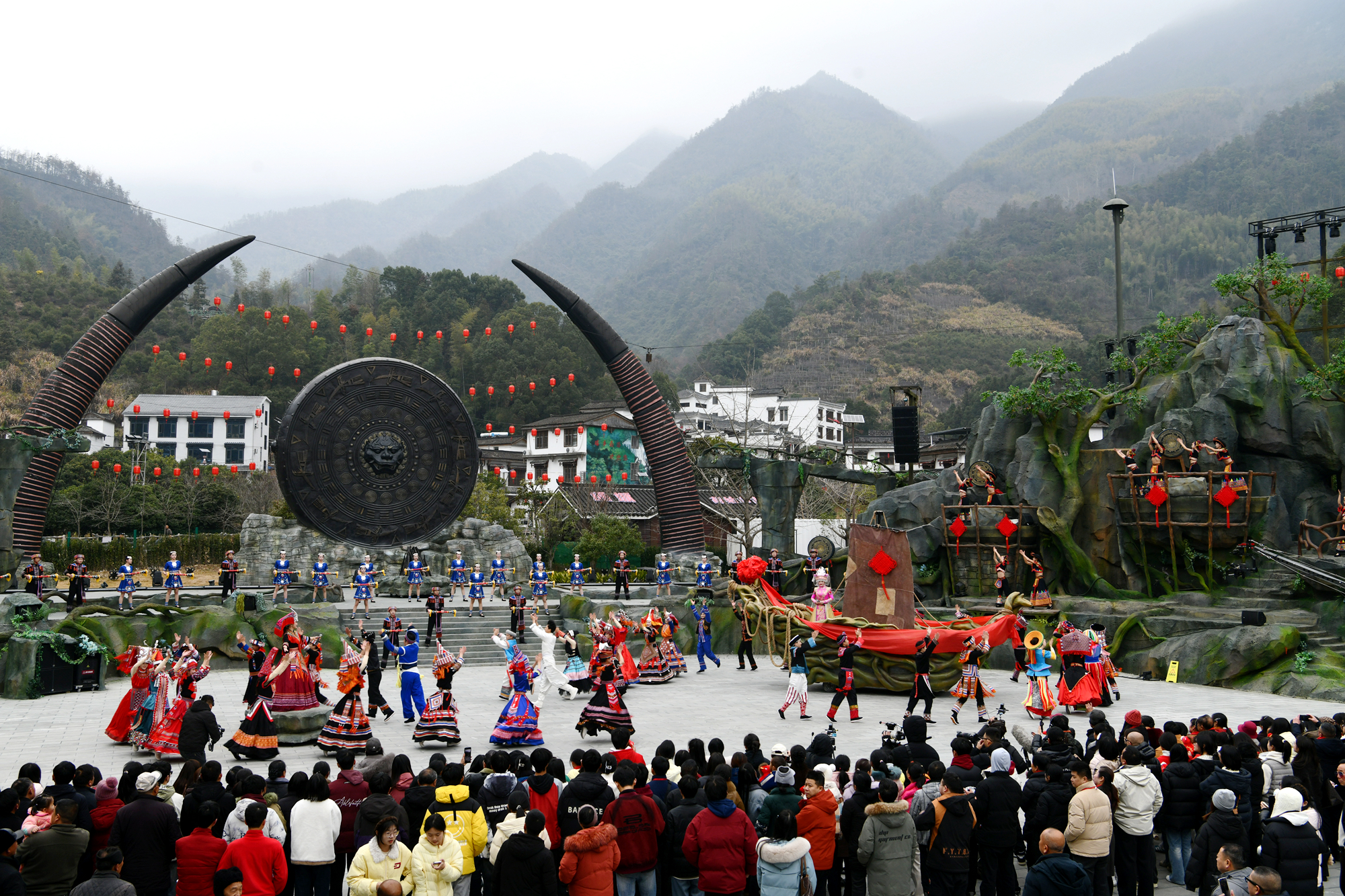 2026年1月27日,游客在湖北省咸宁市通城县药姑山古瑶村景区观看巜龙船调》表演。