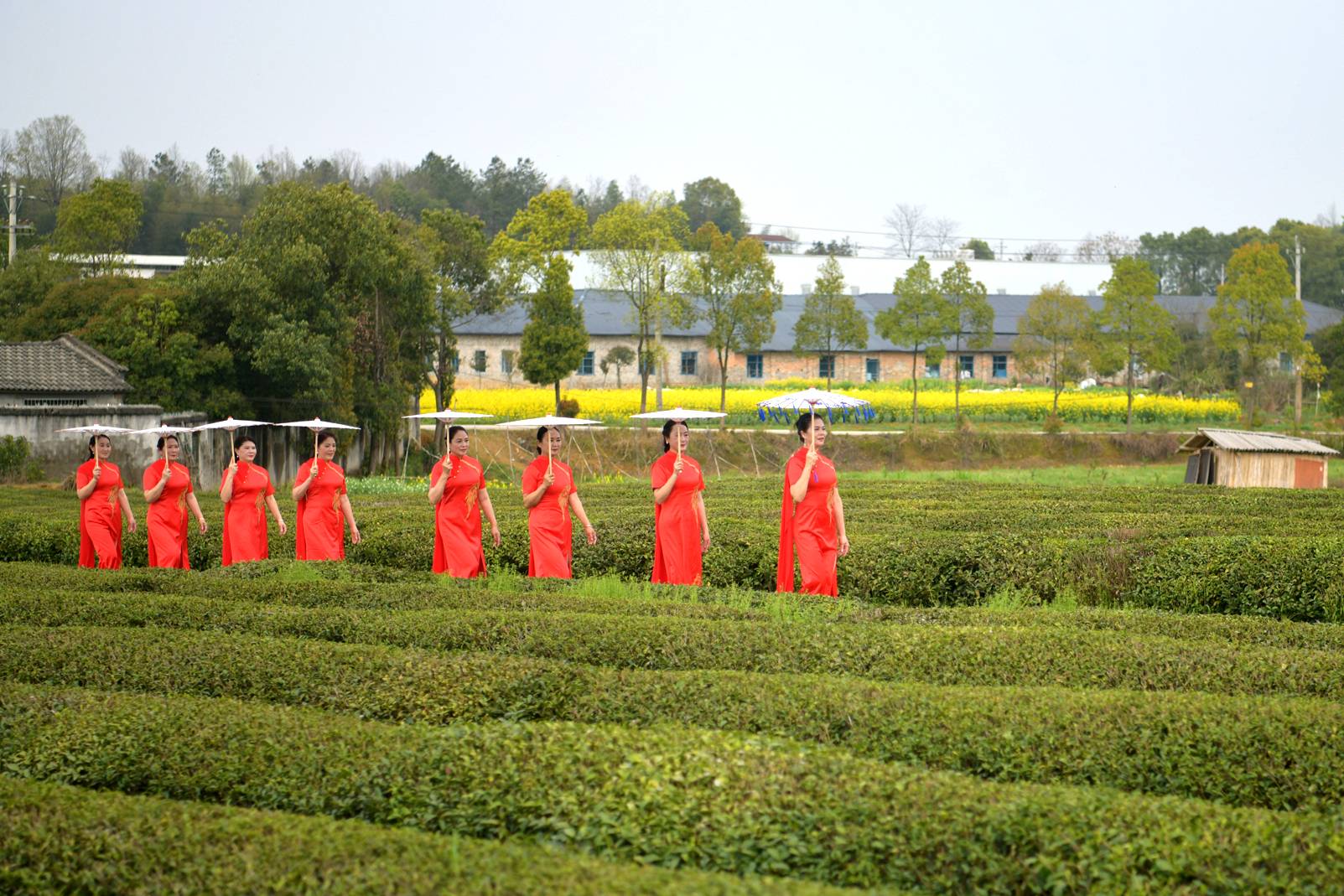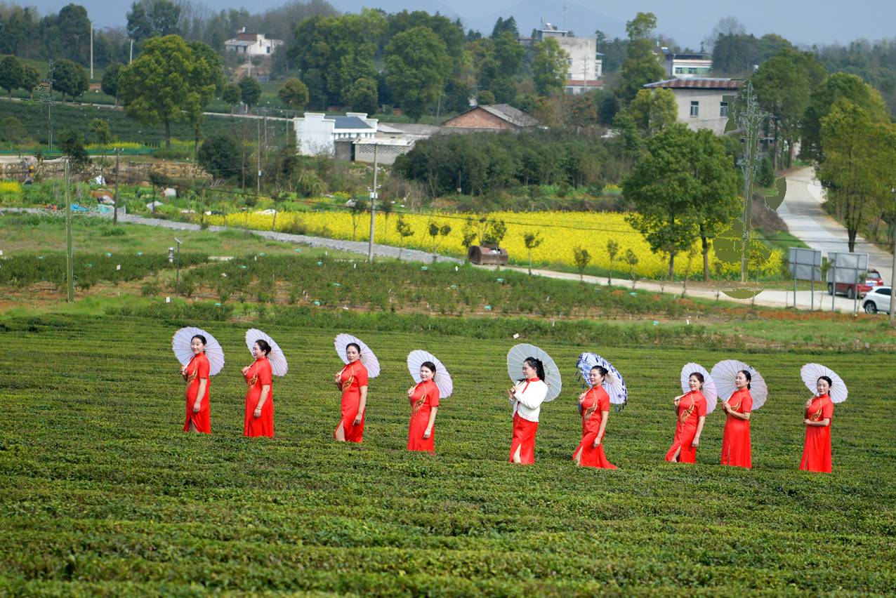 2026年3月27日,旗袍爱好者在通城县沙堆镇大柱山霞光茶业茶园走秀。