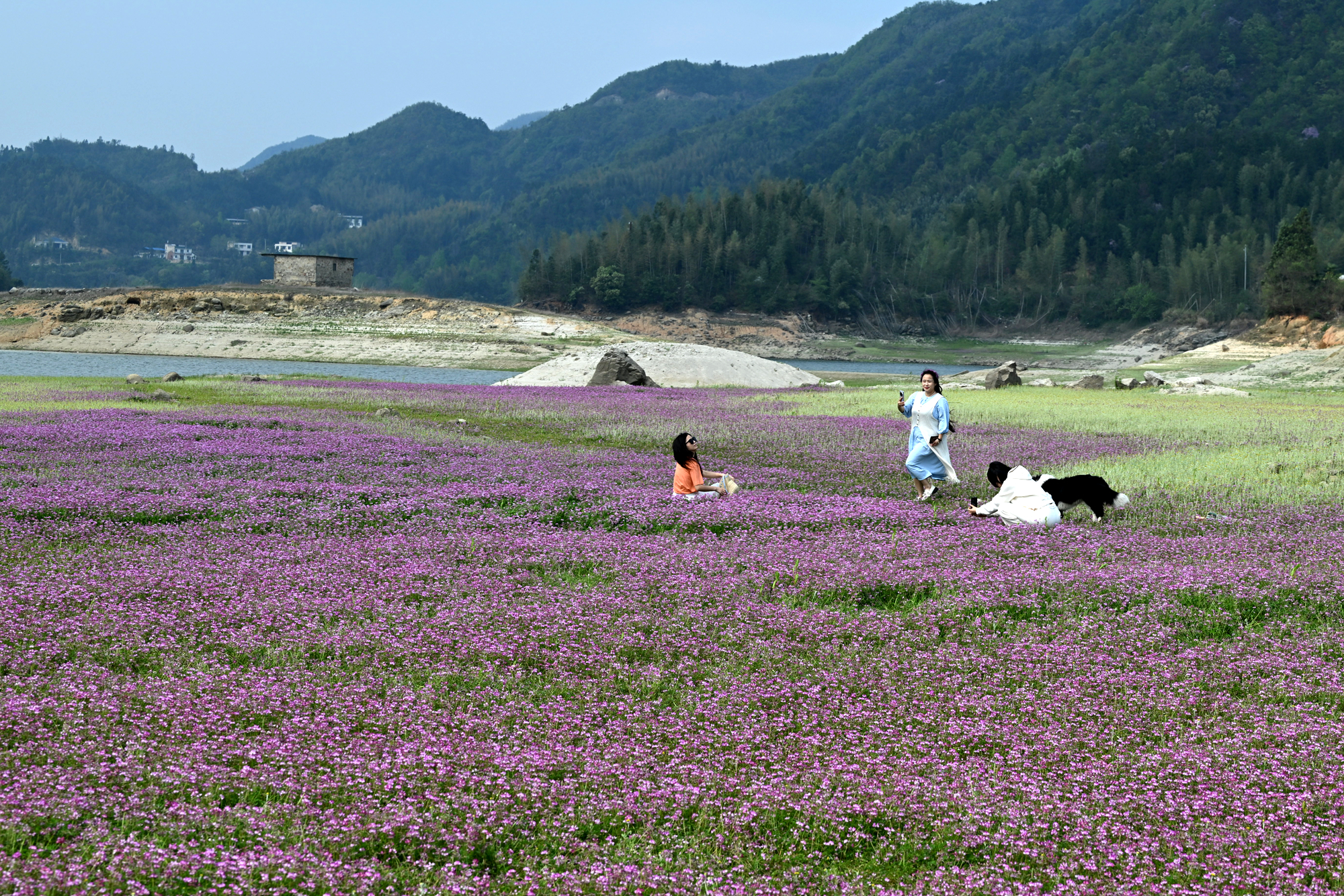 连日来,百丈潭水库上游大面积滩涂紫云英进入盛花期,连片的紫红色花海铺展开来,与周围的青山绿水、村落农舍相互映衬,构成一幅和谐美丽的乡村田园画卷。不少游客专程赶来,徜徉花海之间,或拍照留念,或拍摄抖音短视频,共赴一场春日之约。