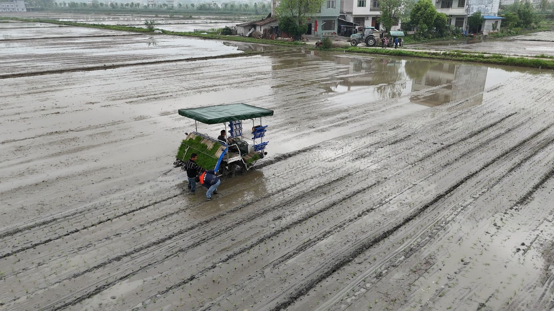 4月17日,在五里镇陈谷村的通城县五里明海农业耕种专业合作社,三台插秧机正穿梭于田间紧张作业。插秧机上整齐摆放着秧盘,随着机器前行,一株株秧苗从盘中有序滑落、精准插入泥中,不多时,整片水田便披上了绿装。