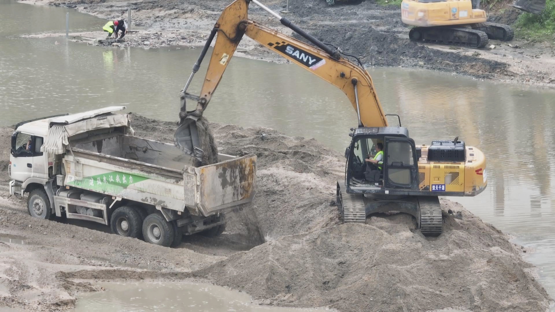 4月17日,在柳堤路隽水河畔,多台大型挖掘机伸长铁臂,正有序清理河道底部沉积多年的淤泥。一斗斗黑褐色的淤泥被挖出河床,装入等候在旁的大型运输车辆。