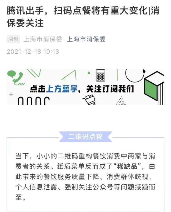 12月18日,据“上海市消保委”微信公众号消息,近日,腾讯公司向开发者推送了关于自查“扫码点餐强制关注公众号”问题的通知。
